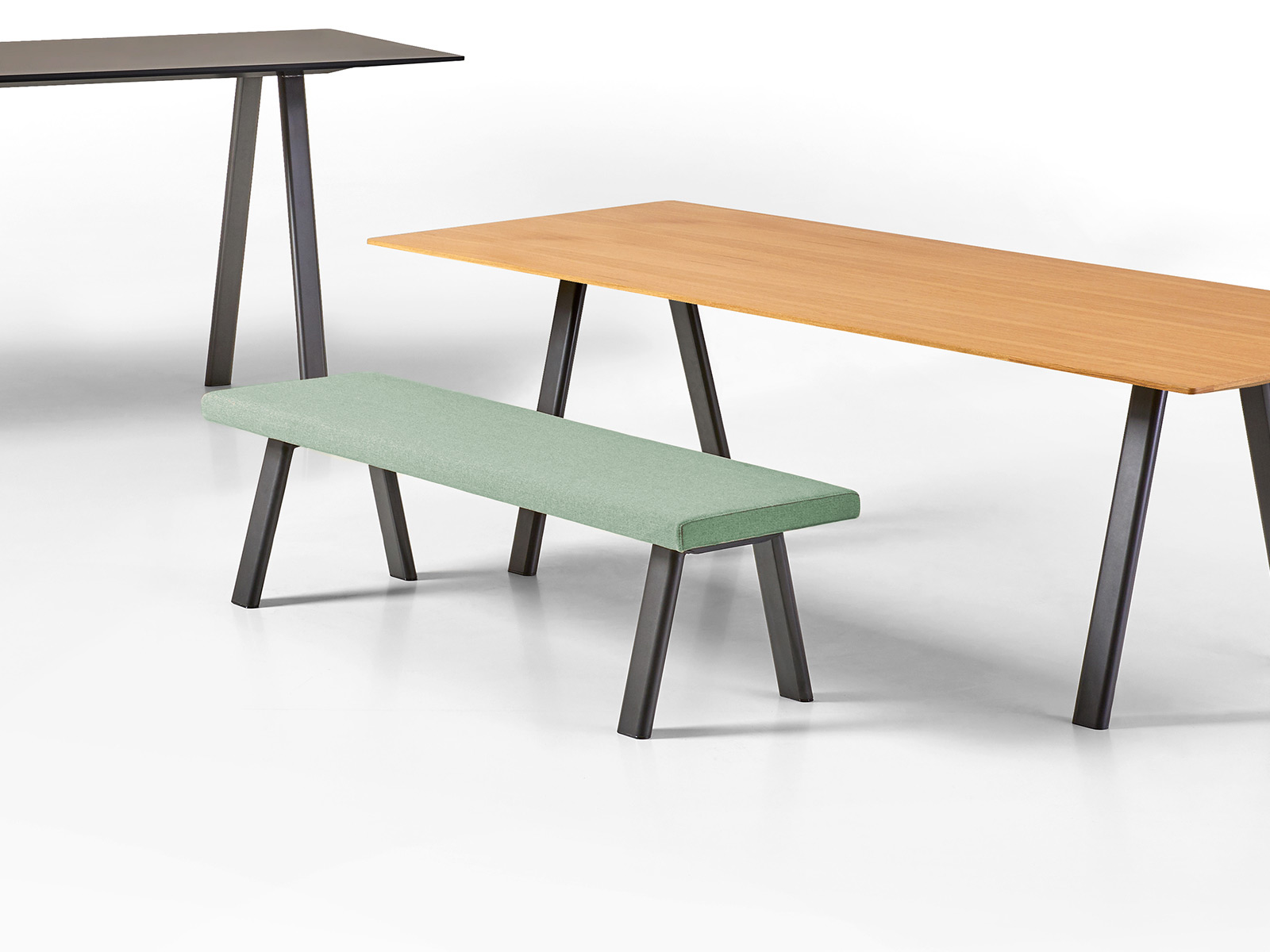 La collection comprend aussi des tables Plania hauteur 75, 90 et 104 cm qui s'accordent aux bancs et permettent de créer des espaces conviviaux et harmonieux.