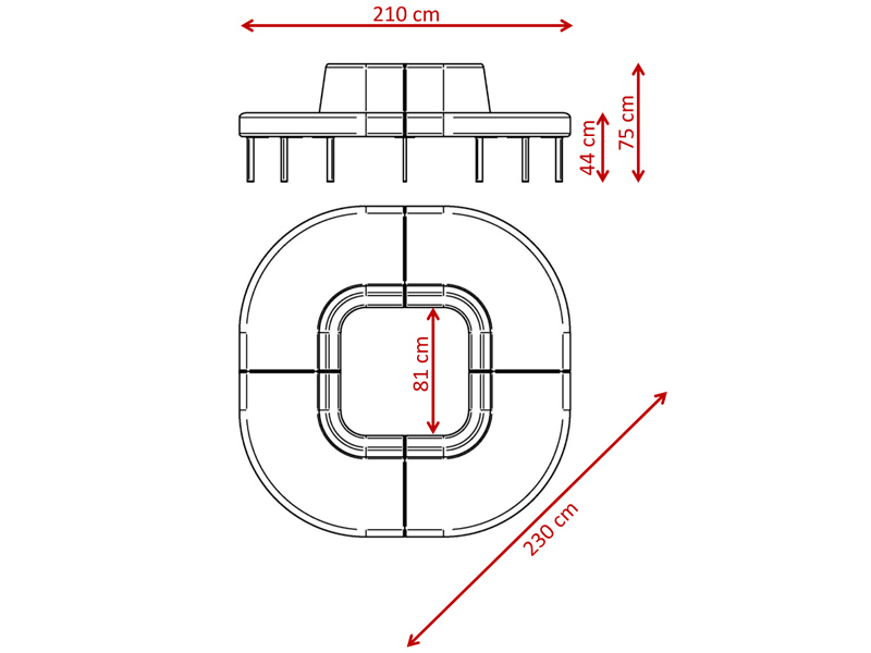 Chaque module, aux dimensions de 102 x 102 cm, peut accueillir jusqu’à 2 personnes, permettant une capacité totale de 8 personnes. Dans sa configuration circulaire, l’ensemble du canapé mesure 230 x 230 cm. Cette gamme propose également un module d’angle fermé à 90°, offrant la possibilité de configurer la banquette avec le dossier orienté vers l’extérieur.