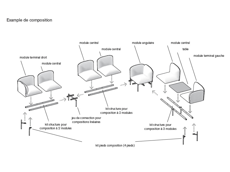 - Modularité : Pour les modules dépourvus de pieds, il faut commander les kits structure et pieds nécessaires à l’assemblage.