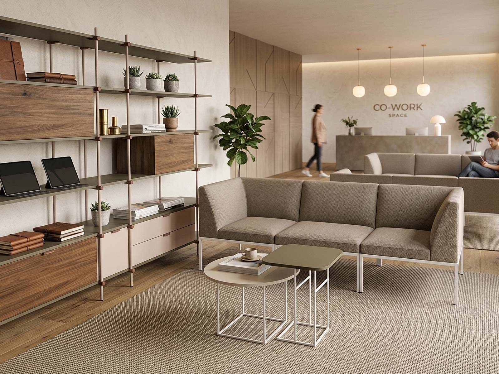 tables basses de la gamme Moé afin de composer un ensemble cohérent et harmonieux dans les espaces d’accueil professionnels.