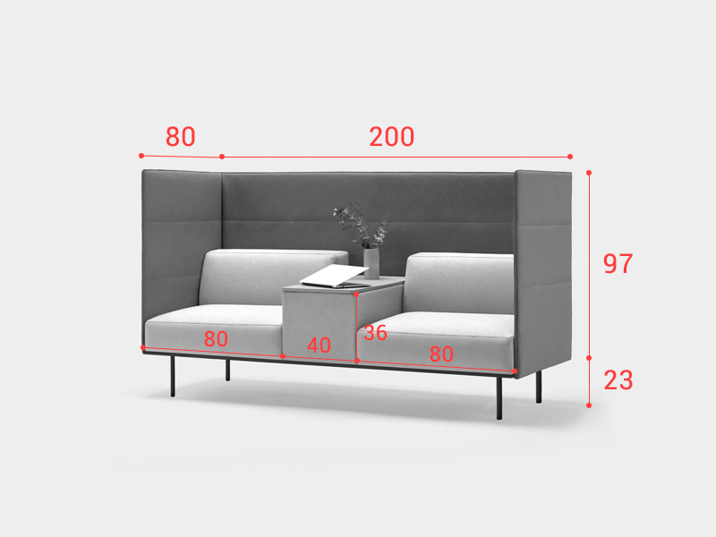 L'ensemble propose une dimension de 200 x 80 cm qui se compose comme suit : 2 assises de 80 cm de large et 1 tablette de séparation 40 cm. La hauteur de l'assise est de 42 cm, la hauteur du dossier est de 69 cm et la hauteur de la cloison est de 120 cm.