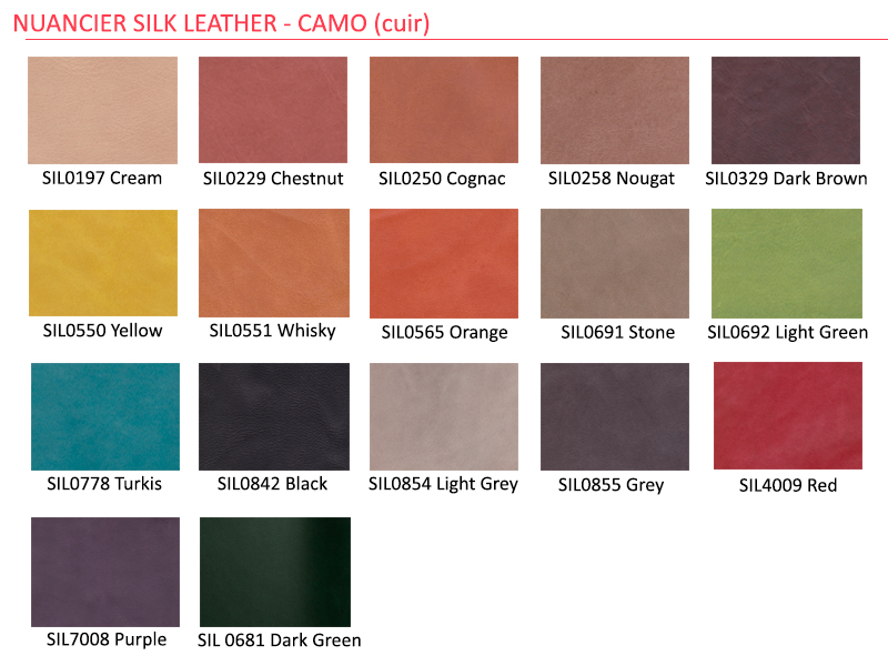 Nakki est recouvert ici d'un tissu Silk Leather du fabricant Camo, mais peut être recouvert dans d'autres tissus et coloris, sur demande.