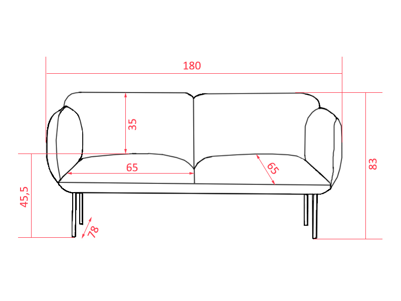 Le canapé mesure 180 cm de largeur, 78 cm de profondeur et a une assise à 45,5 cm du sol. Chaque assise a une dimension très agréable et mesure environ 65 cm de profondeur et 70 cm de largeur.