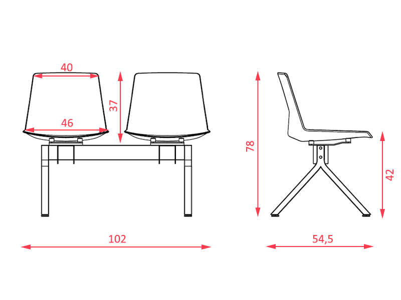 La version 2 places mesure 102 cm de largeur. La version 3 places mesure 157 cm de largeur. Origami a un encombrement de 54,5 cm de profondeur et 78 cm de hauteur. La hauteur d'assise des sièges est de 42 cm.