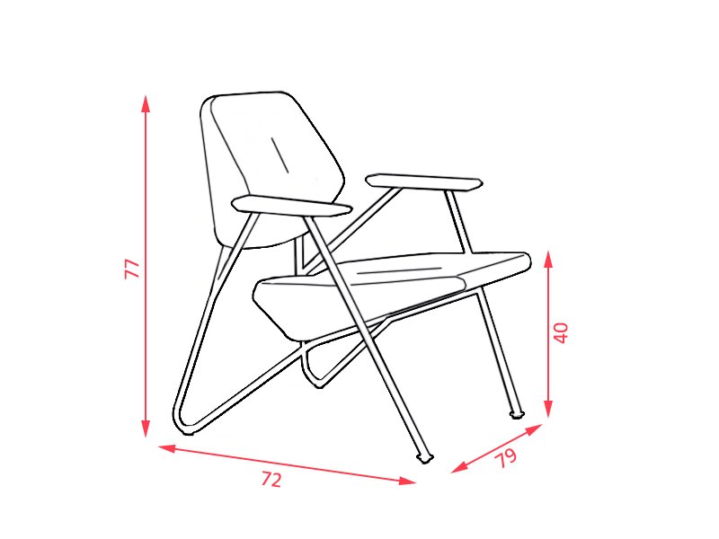 Le fauteuil Polygon a un encombrement de 72 cm de profondeur, 79 cm de largeur et 77 cm de hauteur. Son assise en dévers est à 40 cm du sol.