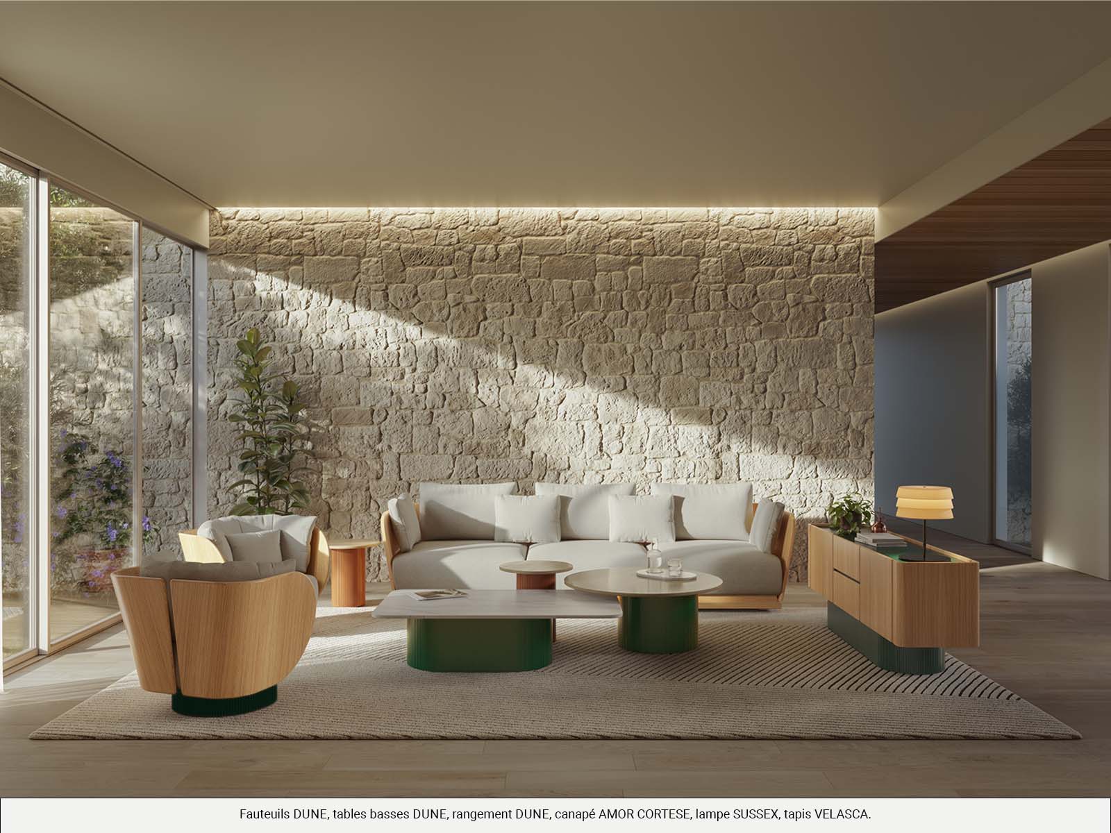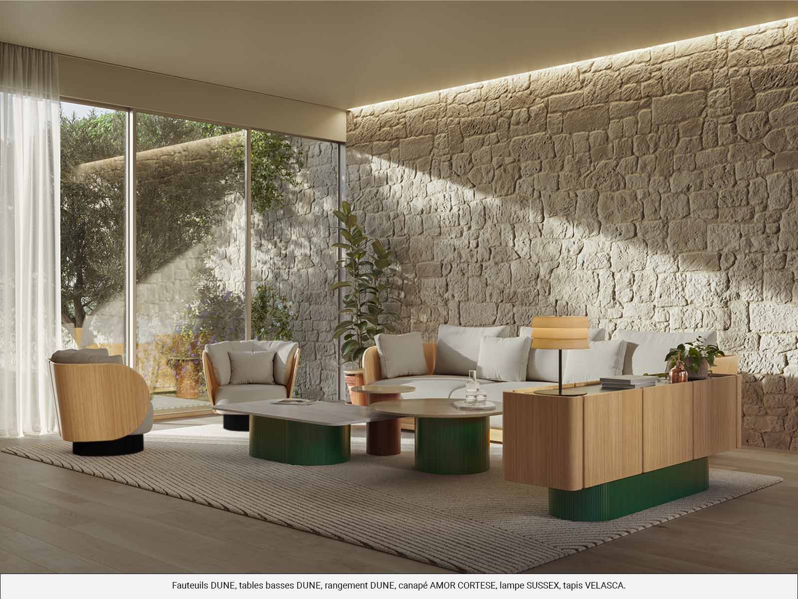 Optez pour une harmonie des matériaux en associant Dune à un canapé minimaliste et un éclairage doux, mettant en valeur ses formes organiques.
