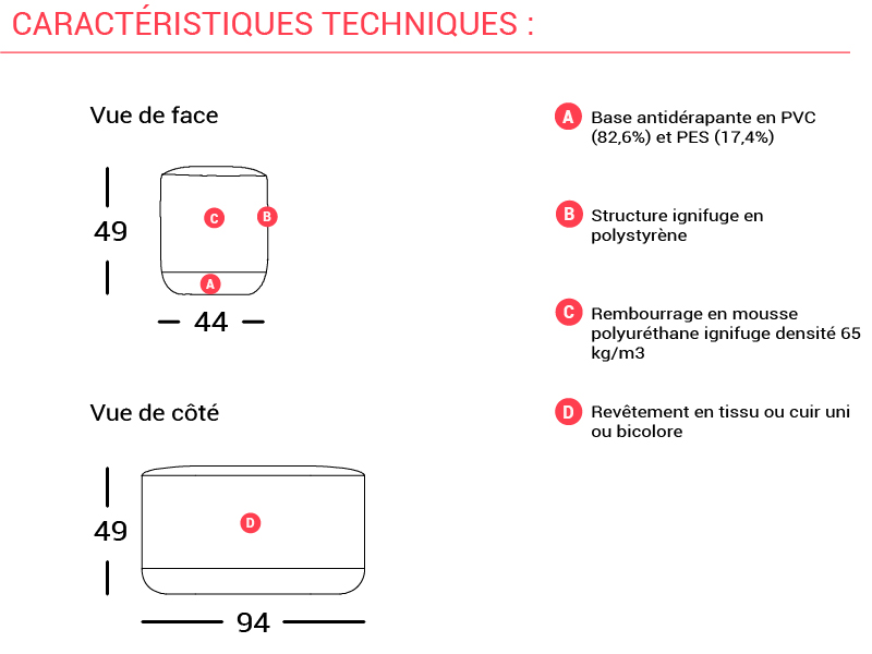 Dans cet article, nous vous suggérons le pouf MoBi sous deux finitions en tissu bicolore : vert foncé/vert clair ou rouge/violet. D'autres coloris et revêtements sont disponibles, contactez notre équipe commerciale pour plus de conseils.