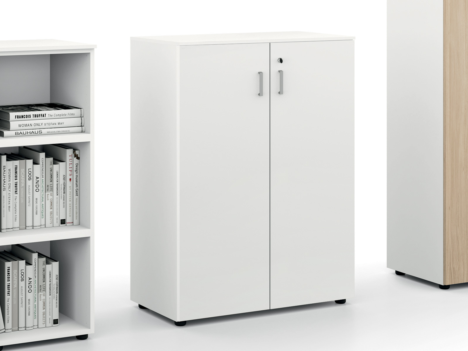 L'armoire a une structure en mélaminé avec portes battantes d'épaisseur 18 mm. Elle est équipée de 2 étagères métalliques de 25 mm avec prédisposition pour les dossiers suspendus, de poignées en zama de finition aluminium et d'une serrure avec clé pliable.