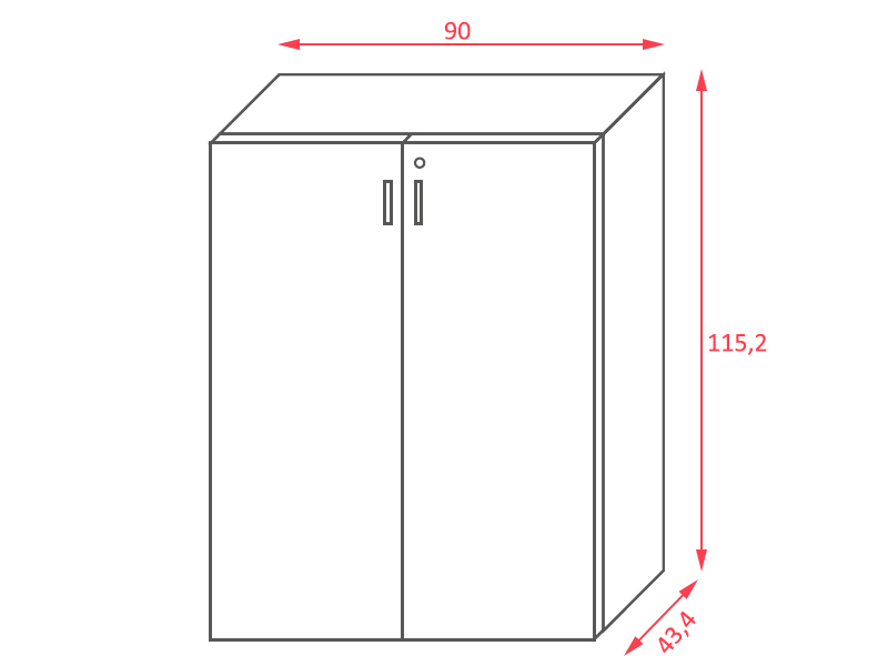 L'armoire mesure 115,2 cm de hauteur, 90 cm de largeur et 43,4 cm de profondeur.