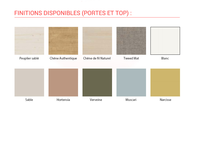 Le top de finition est assorti ici à la structure, mais peut être coordonné aux portes. Les portes et le top de finition se déclinent en 10 finitions mélaminé.