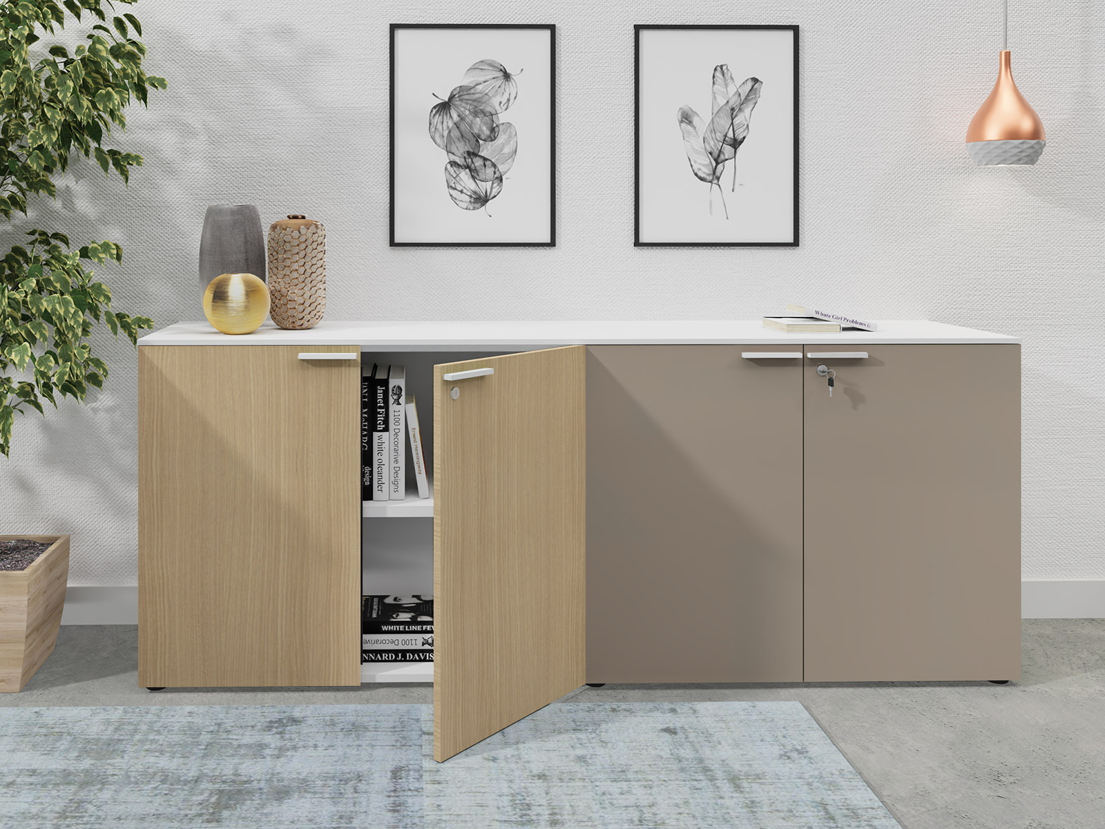 Voici un ensemble de 2 armoires basses avec des portes en mélaminé que vous pourrez arranger de différentes manière afin d'obtenir un ensemble moderne et rythmé. Ce rangement d'entreprise aux dimensions relativement compactes (