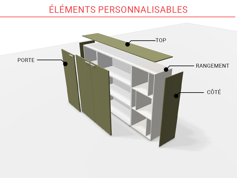Chaque composant est personnalisable en termes de coloris : le top et les côtés, les portes battantes, les poignées, et la bibliothèque. Conçue pour un usage professionnel, l'armoire Giorno est fabriquée en bois mélaminé haute densité, lui permettant de supporter du poids et de résister à l'usure quotidienne.