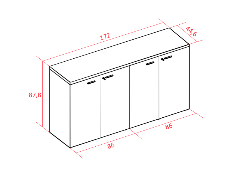 Chaque structure d'armoire mesure 86 cm de hauteur, 86 cm de largeur et 44,6 cm de profondeur. L'ensemble mesure 172 cm de largeur totale et 87,8 cm de hauteur totale.
