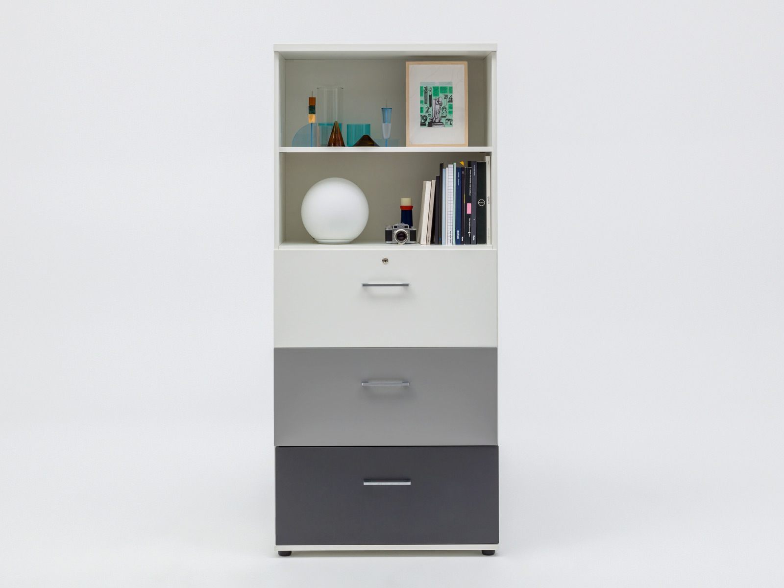 Les tiroirs sont proposés ici en 3 coloris distincts : blanc, gris aluminium et gris anthracite.
