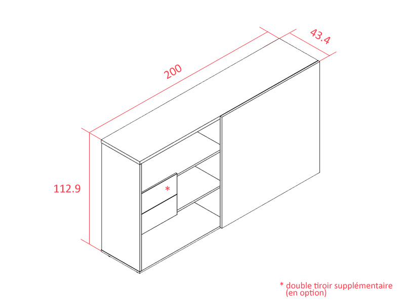 L'armoire mesure 2 mètres de longueur, 43,4 cm de profondeur et 112,9 cm de hauteur.