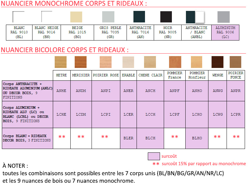 - 9 décors bois sont proposés sur ce modèle : chêne clair, hêtre, merisier, poirier foncé, poirier rose, pommier de France, wengé, pommier de Honfleur et érable.