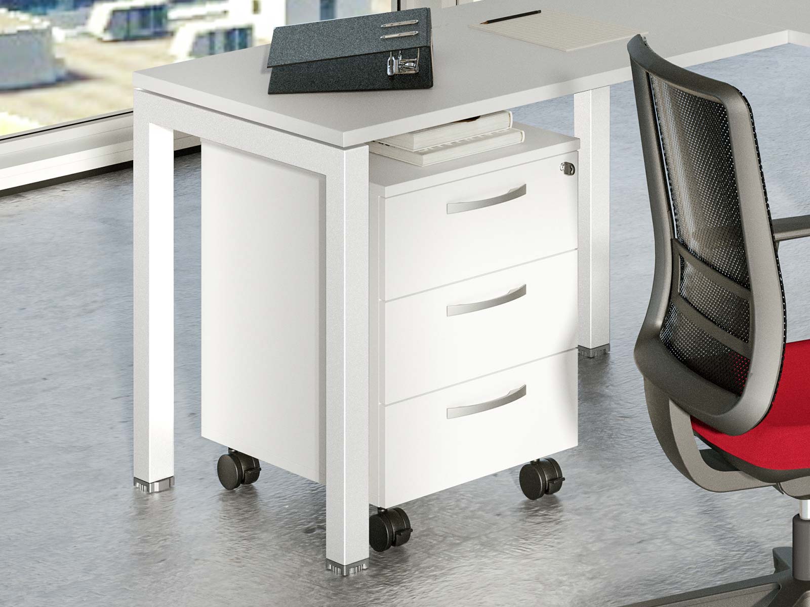 Ce caisson mobile a été conçu pour s'assortir aux finitions des bureaux de la collection Melvin. Il dispose de 3 tiroirs équipés de glissières métalliques avec butée ainsi qu'une serrure sur le premier tiroir. Une version montée sur pieds cadre en métal est disponible sur demande.