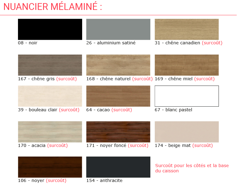 Le caisson est en mélaminé d'épaisseur 18 mm avec chants en PVC.