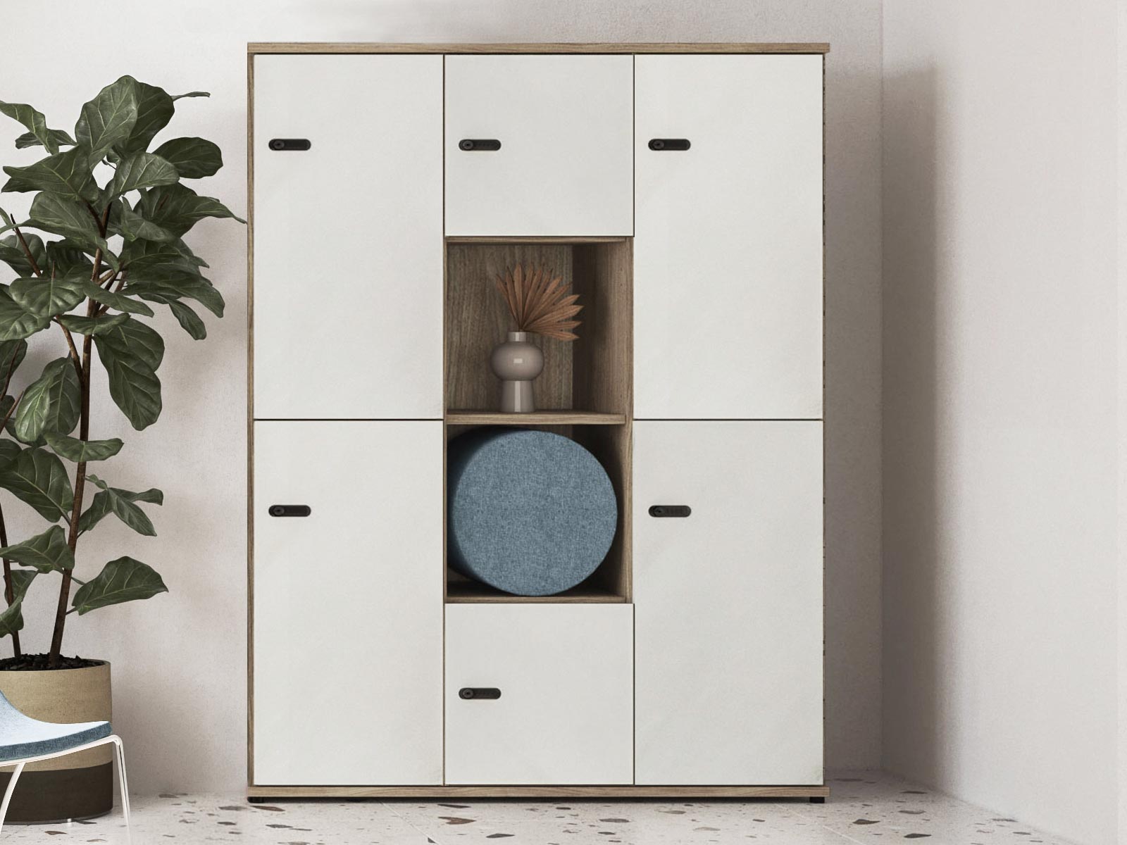 portes doubles et casiers sans porte. La combinaison de ces rangements et des différentes finitions modernes offre un ensemble élégant et fonctionnel.