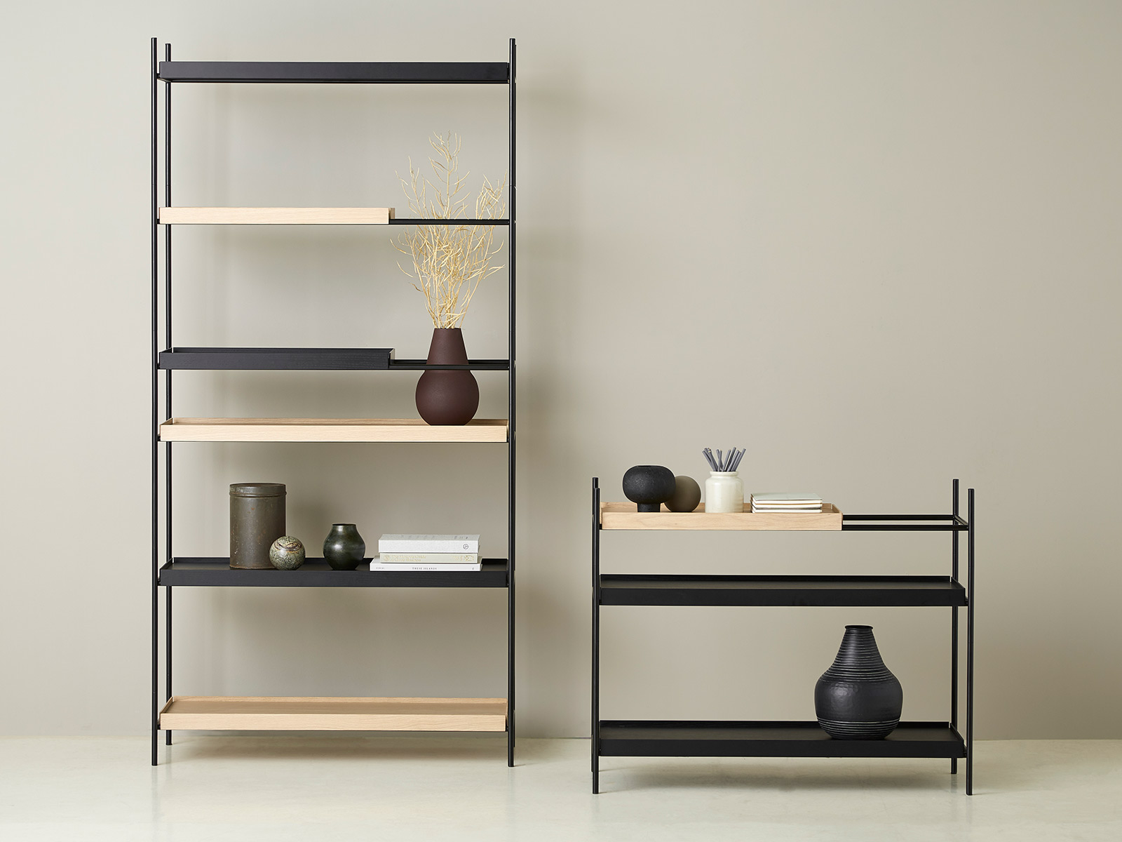 - 3 étagères : 1 petite en chêne naturel, 2 grandes en chêne teinté noir (choix chêne teinté noir / chêne naturel dans le configurateur)