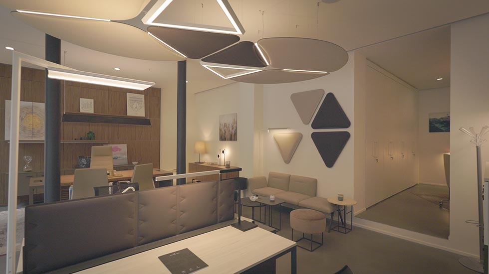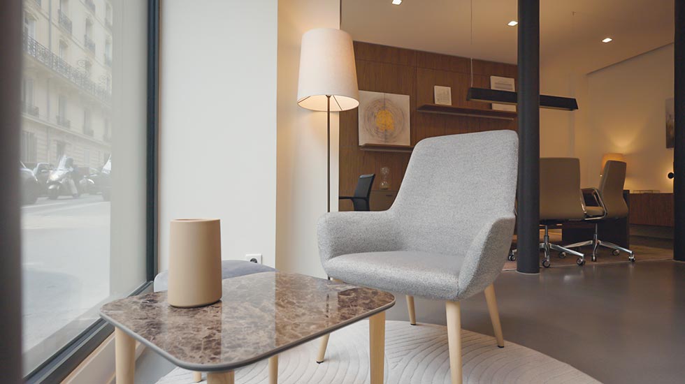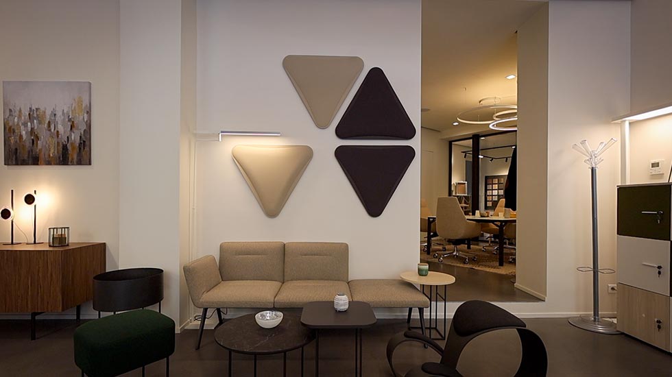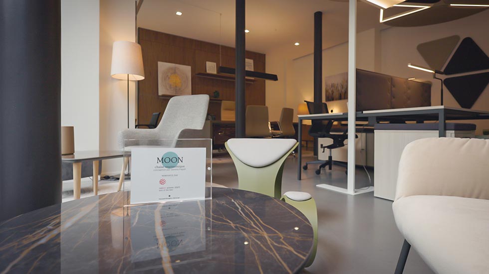 Mobilier de bureau, assises lounge, solutions acoustiques et luminaires.
