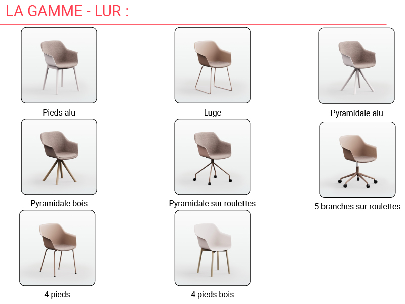 Notre configurateur vous conseille la chaise Lur dans des tons unis. L’ensemble de la gamme et des nuanciers sont à retrouver depuis nos présentations visuelles du produit. Notre équipe Burolia est disponible pour vous accompagner dans votre personnalisation.