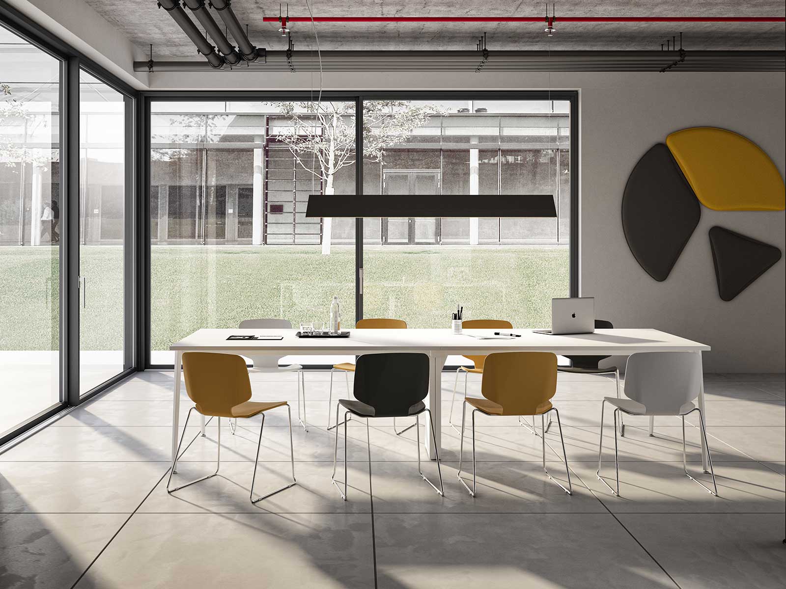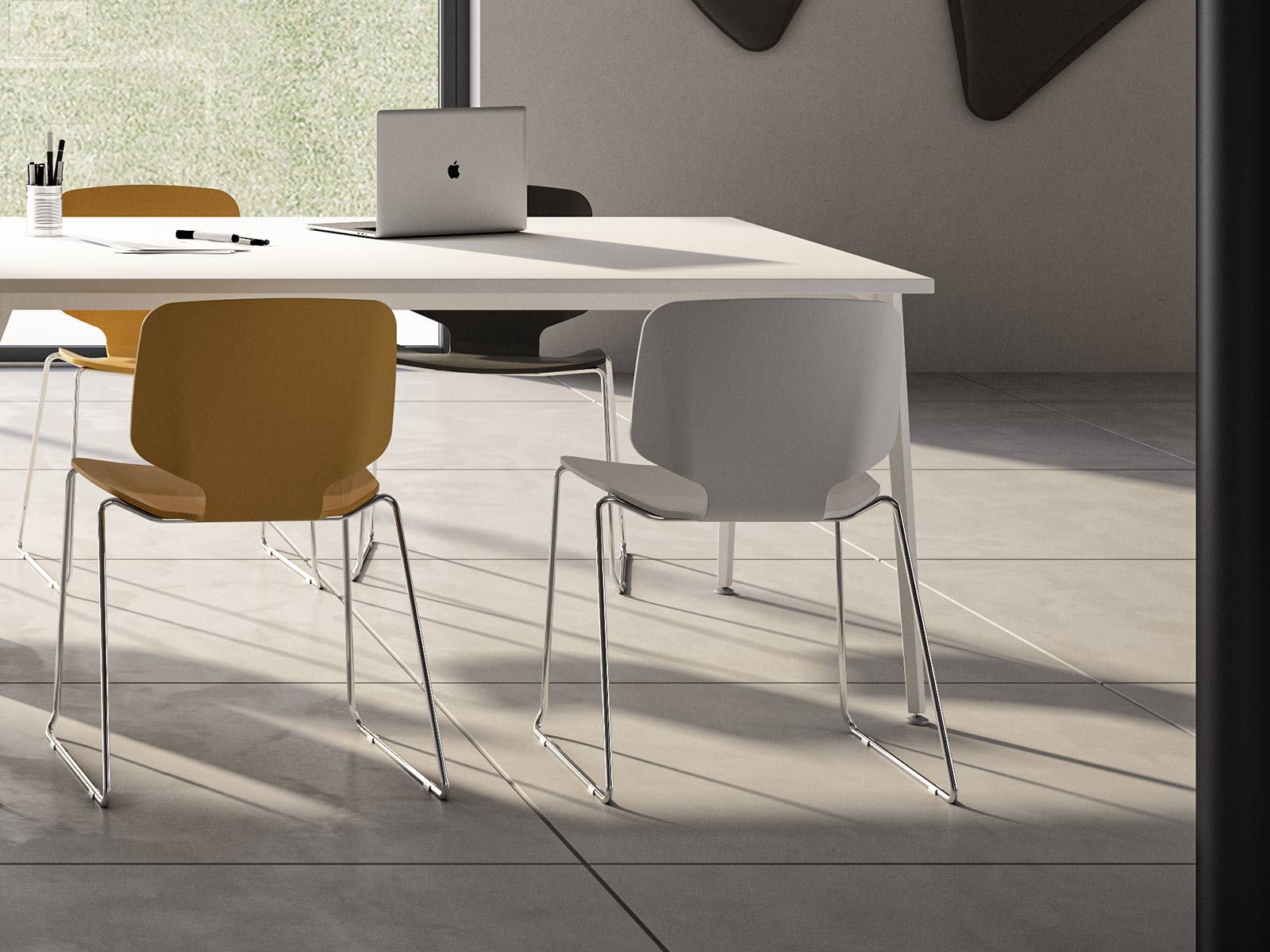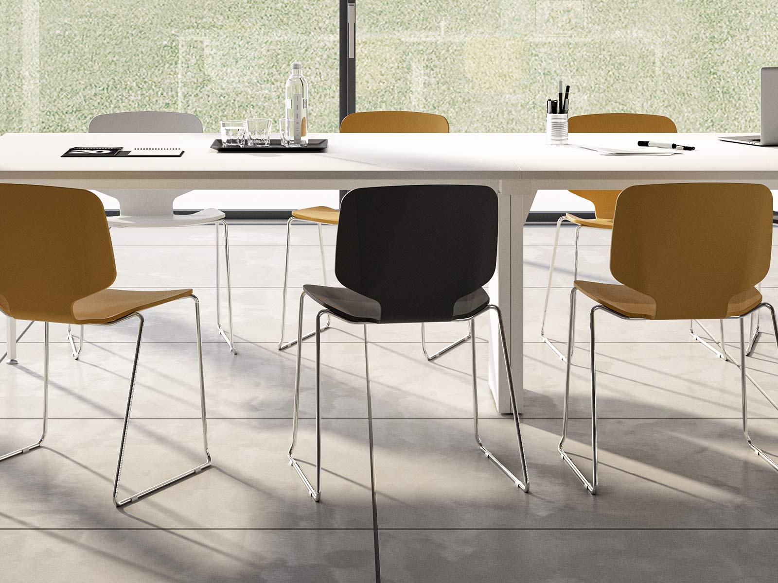 Deco est une chaise polyvalente composée d'une assise en bois laqué et d'un piètement luge chromé. Deco est pratique car elle est empilable, ludique avec ses 6 finitions et possède un design sobre et élégant qui lui permet une intégration et une utilisation dans des milieux variés : espaces collectifs, de détente, de restauration, zones de travail informel ou salles de réunion.