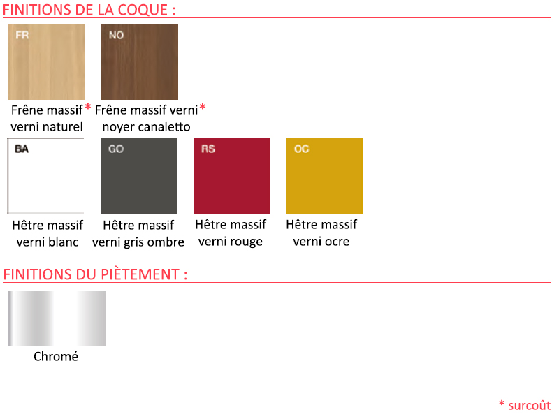 Deco est composée d'une coque laquée en multiplis de hêtre et d'une structure en tube d'acier chromée. La coque peut être laquée dans les 4 couleurs du nuancier, ou avec une couleur sur-mesure (sur demande et sous réserve d'un minimum de quantité). Elle peut être également en placage bois finition frêne verni naturel ou noyer, avec supplément.