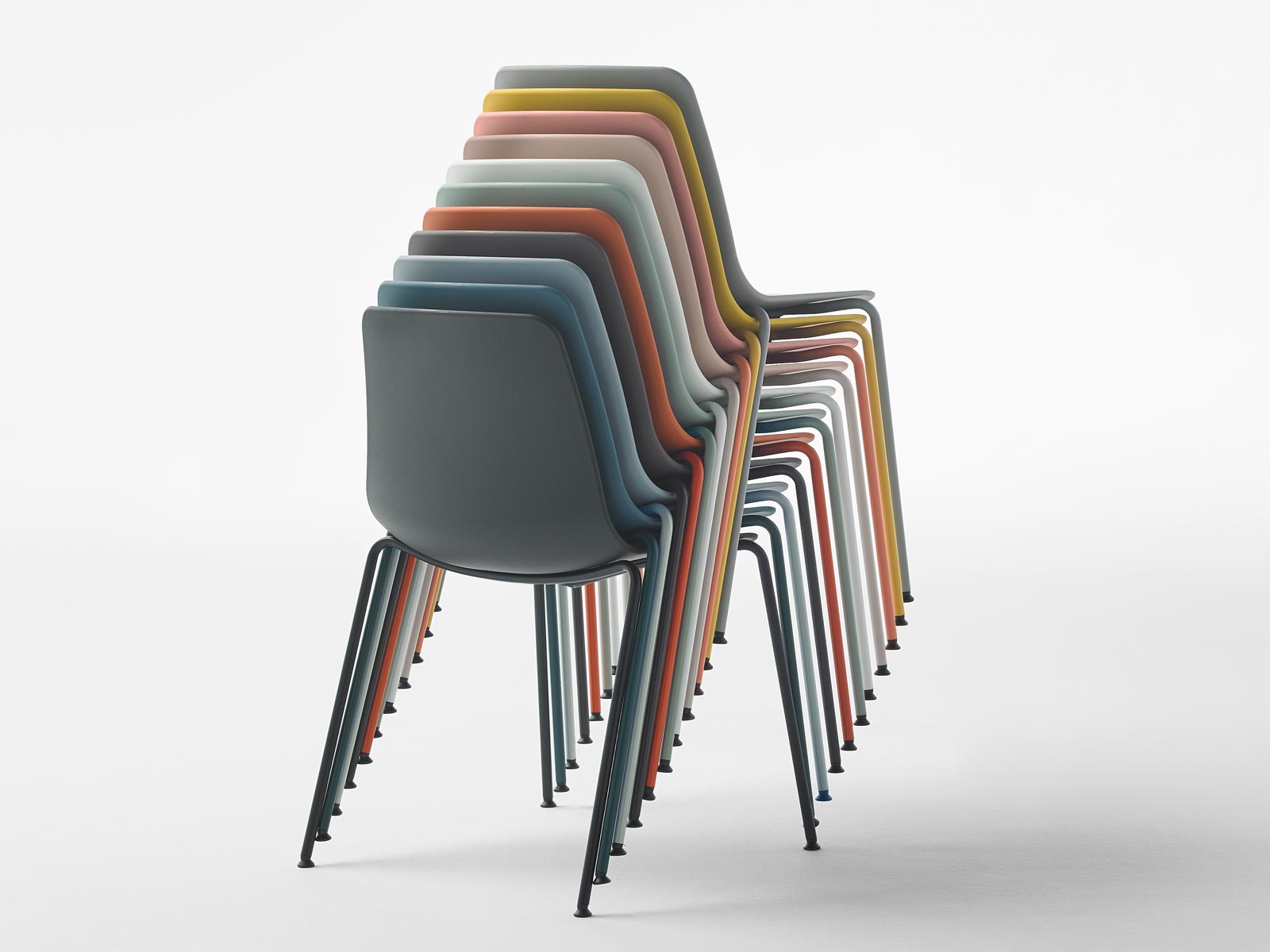 Le piètement métallique permet d'empiler jusqu' à 15 unités (avec le chariot). Il est équipé de patins en plastique par défaut (prendre l'option patins en feutre pour les surfaces dures et délicates). Il proposé en standard en noir, blanc et aluminium et avec supplément, il peut être chromé ou laqué dans 13 couleurs optionnelles du nuancier métal Inclass (voir nuanciers).