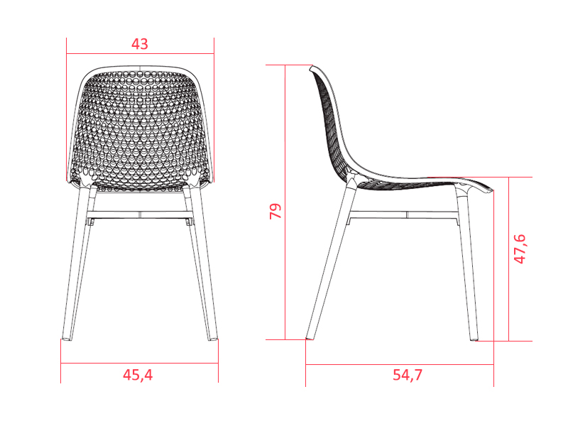 L'encombrement de la chaise est est de 45,4 cm de large, 54,7 cm de profondeur et 79 cm de haut. La hauteur de l'assise est de 47,6 cm et la largeur du siège est de 43 cm. Elle est disponible en 7 coloris modernes.