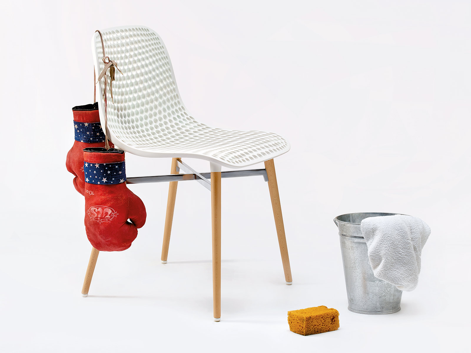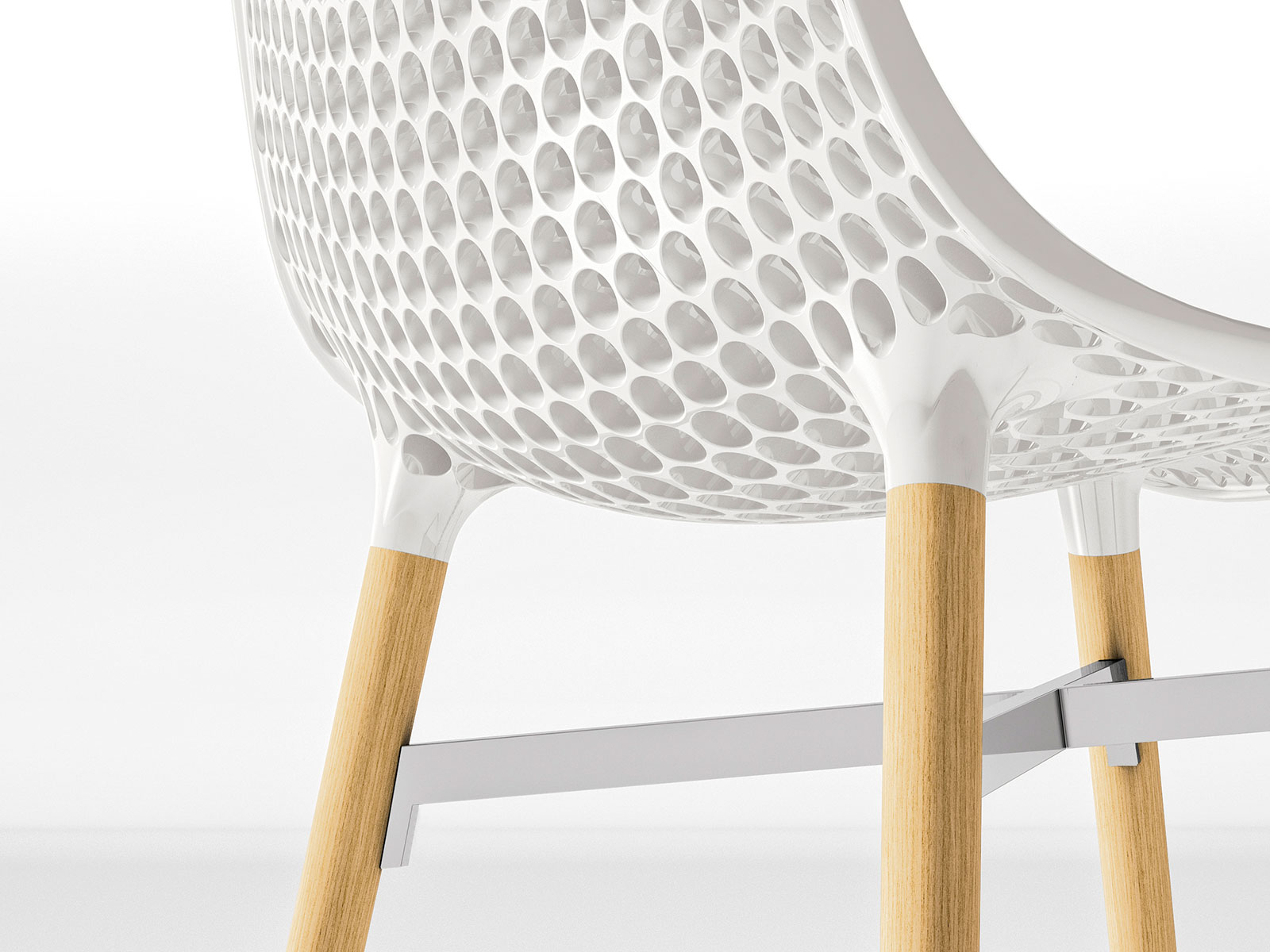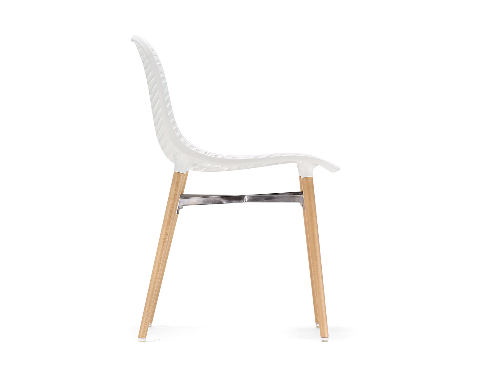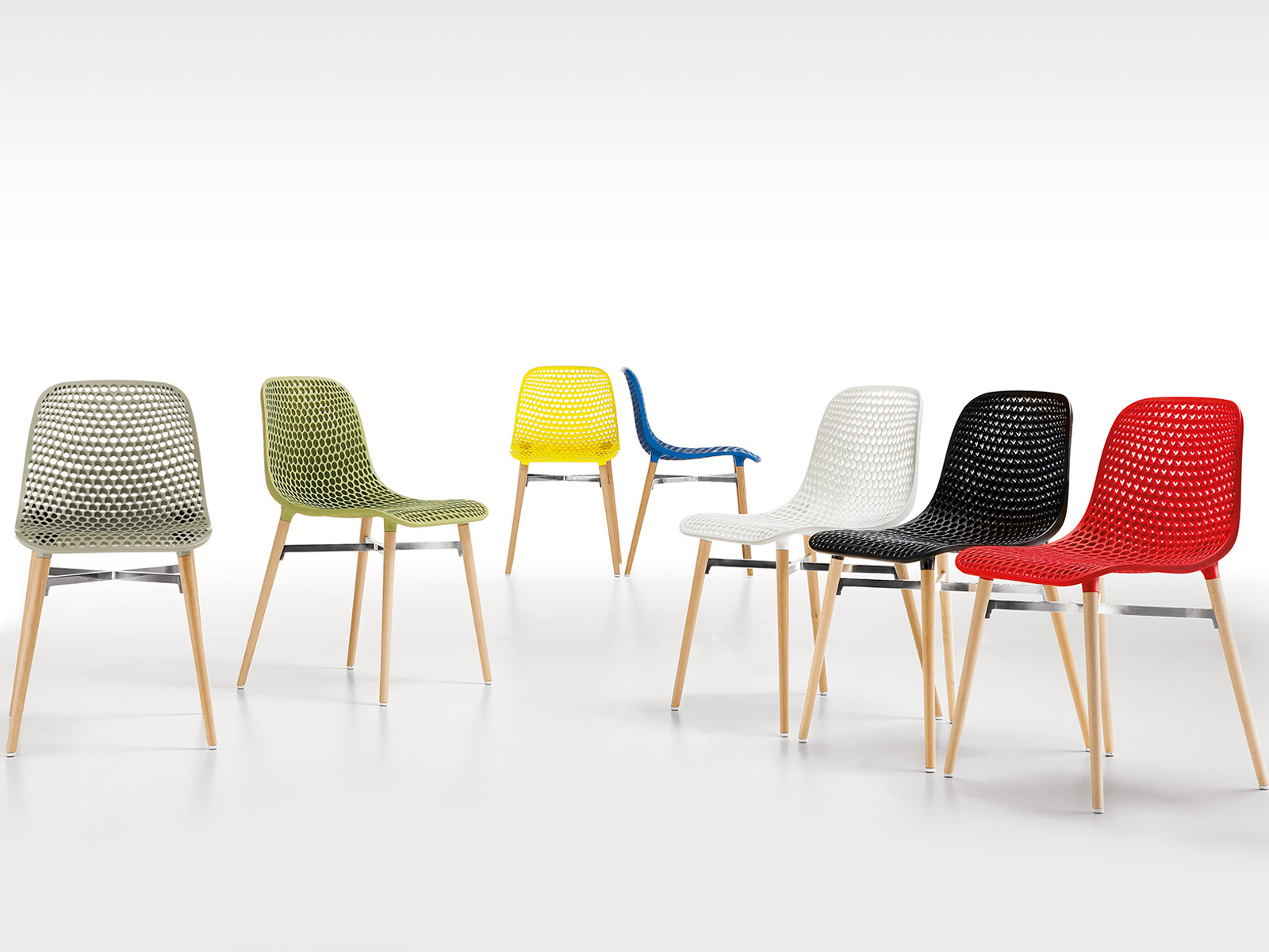 Next est une chaise de collectivité polyvalente avec un piètement en bois et une coque en polyamide perforée. Très contemporaine et confortable, elle trouvera sa place dans les espaces de détente, de restauration ou le scolaire.