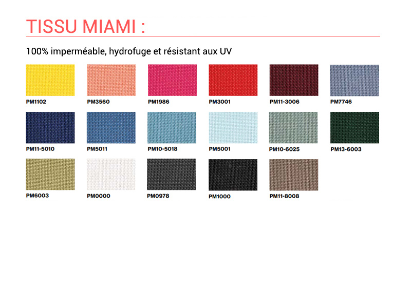 L'assise est recouverte ici d'un tissu spécialement adapté à un usage extérieur : 100 % imperméable, hydrofuge et résistant aux UV.