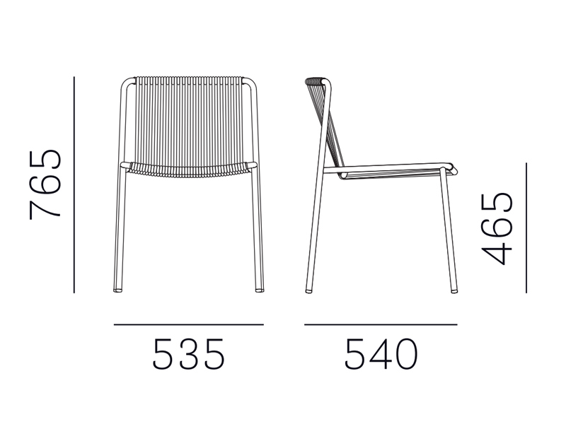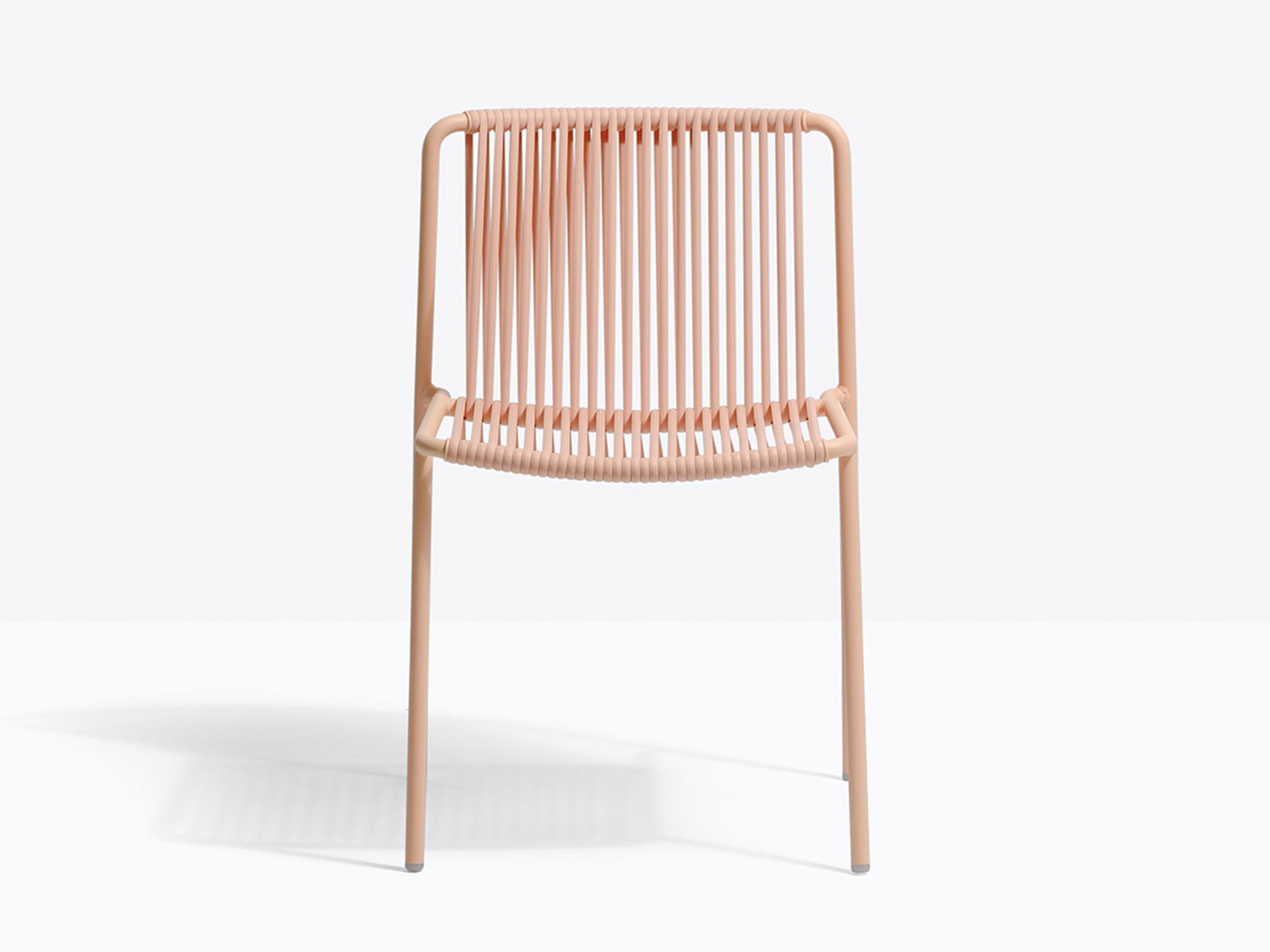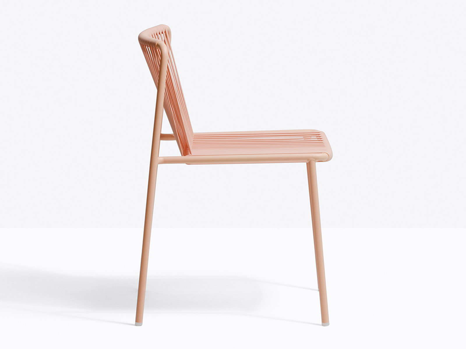 Sa structure en acier peint époxy, d’un diamètre de 20 mm, est conçue pour résister aux intempéries. L’assise et le dossier sont composés de cordes en PVC extrudé avec un cœur en nylon, parfaitement tendues. Le dossier, de la même couleur que la structure, évoque les straps du mobilier de jardin tout en intégrant des matériaux recyclés, témoignant de l’engagement écologique de Pedrali.