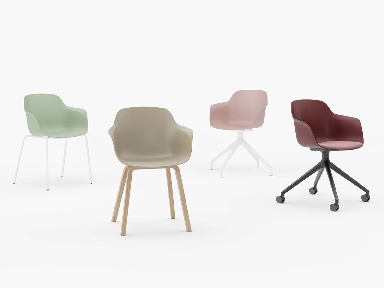 polyvalente, elle dispose de variantes esthétiques fort appréciables lorsque le mobilier doit aménager plusieurs espaces différents ou correspondre à une certaine charte graphique. Ainsi, Loria peut revêtir un placet d'assise ou une coque entièrement tapissée. Le pied contribuera à un changement aussi bien esthétique que fonctionnel. En bois pour les halls d’accueil, 4 pieds métalliques ou traîneaux pour les conférences et 4 branches avec système giratoire pour les salles de réunion. Existe aussi en version haute.