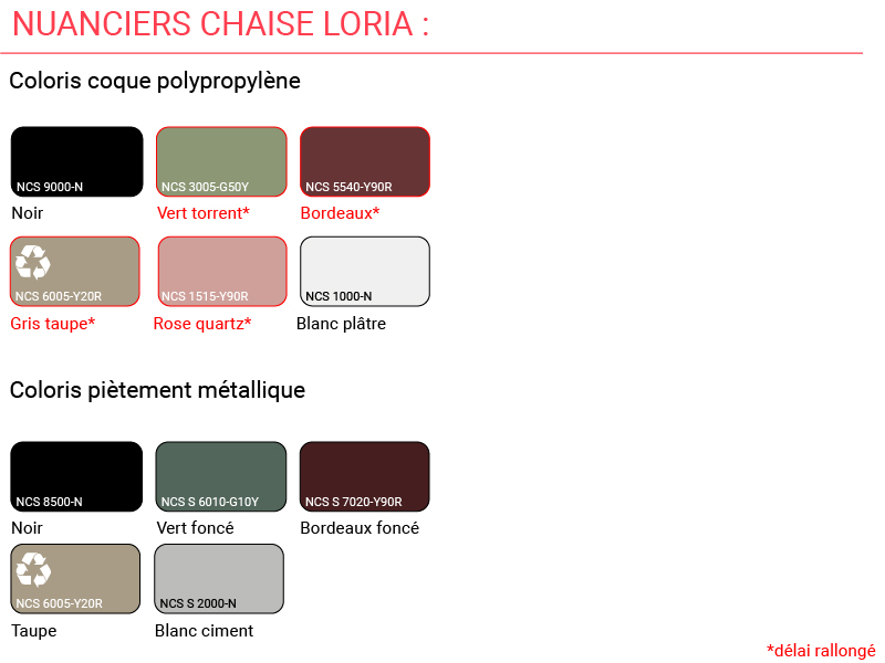 résistance à l’usure quotidienne, aux chocs et aux éraflures. La coque peut être personnalisée dans différentes couleurs. Ainsi, elle se teinte en noir ou en blanc, mais également en vert, en rose ou en bordeaux. Le coloris taupe est préféré pour son aspect écologique. Le piètement en acier peint à l'époxy peut être fini avec un effet chromé en plus des finitions précédentes. Les finitions sont issues du nuancier NCS.