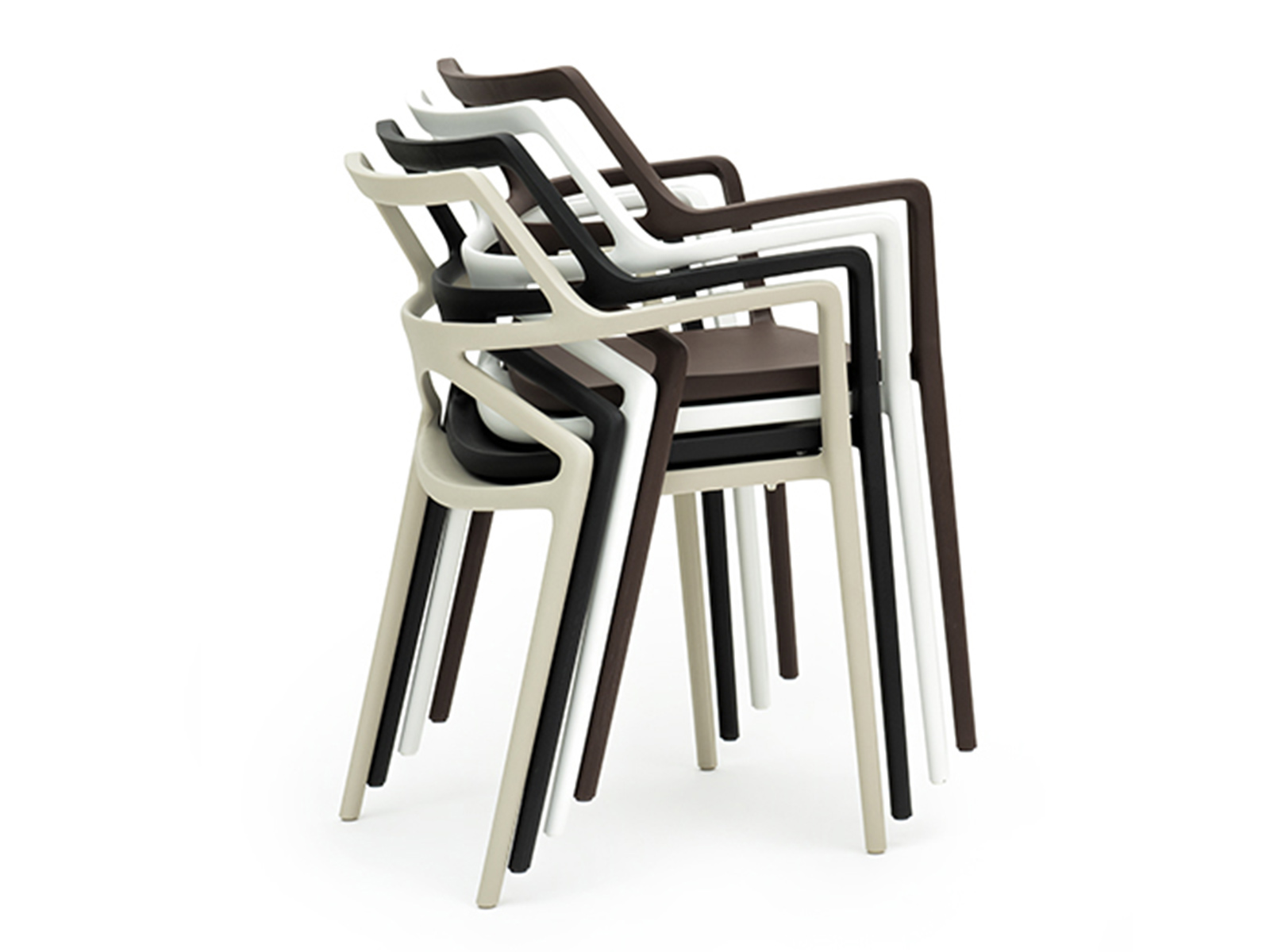 La chaise est en polypropylène 100% recyclable et se décline en 5 coloris mats : blanc, noir, rouge, bronze et écru et 4 coloris laqués : blanc, noir, rouge et anthracite.