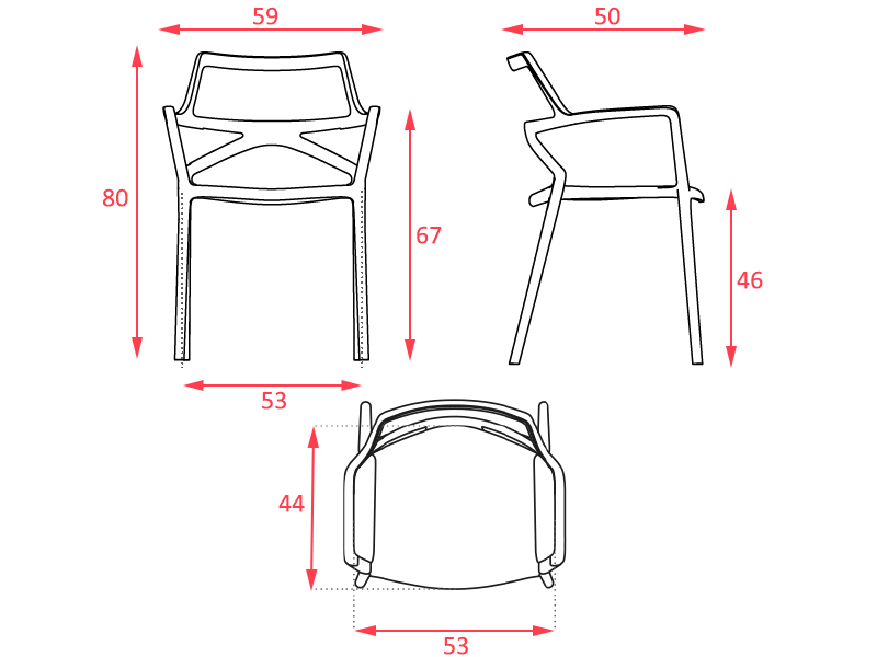 Delta mesure 59 cm de largeur, 50 cm de profondeur et 80 cm de hauteur. Son assise mesure 44 cm de profondeur et est à 46 cm du sol.
