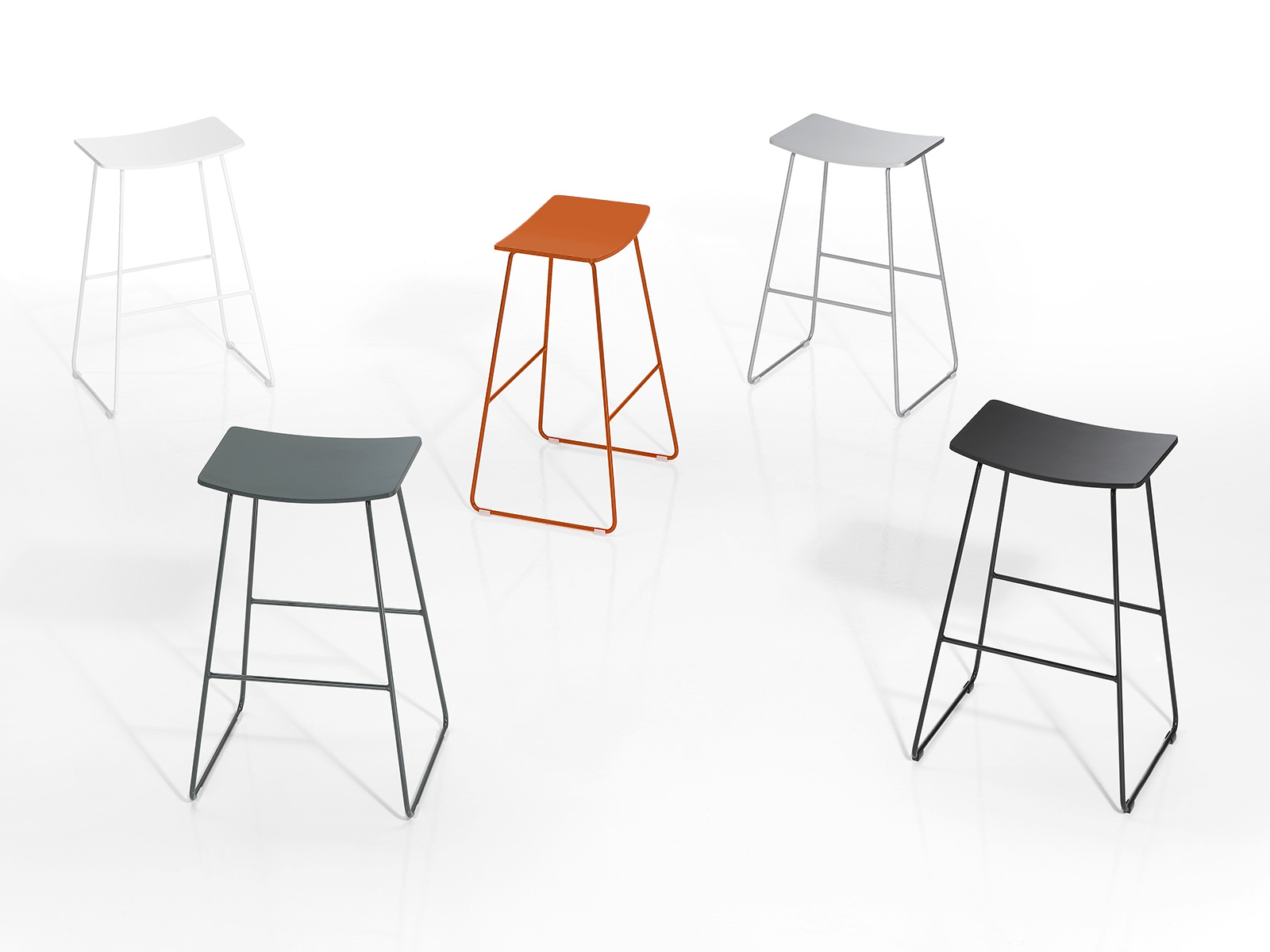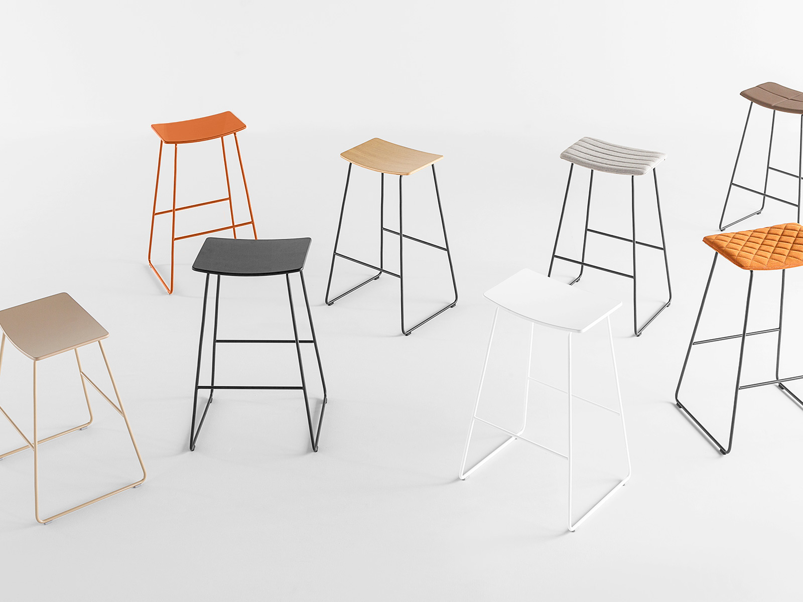 La collection se compose également de tabourets avec assise en placage de bois (chêne ou hêtre) ou tapissée. Les assises tapissées existent avec différents motifs de surpiqûres et peuvent être tapissées dans tous les tissus et cuirs du nuancier Inclass ou avec un tissu client sur demande.