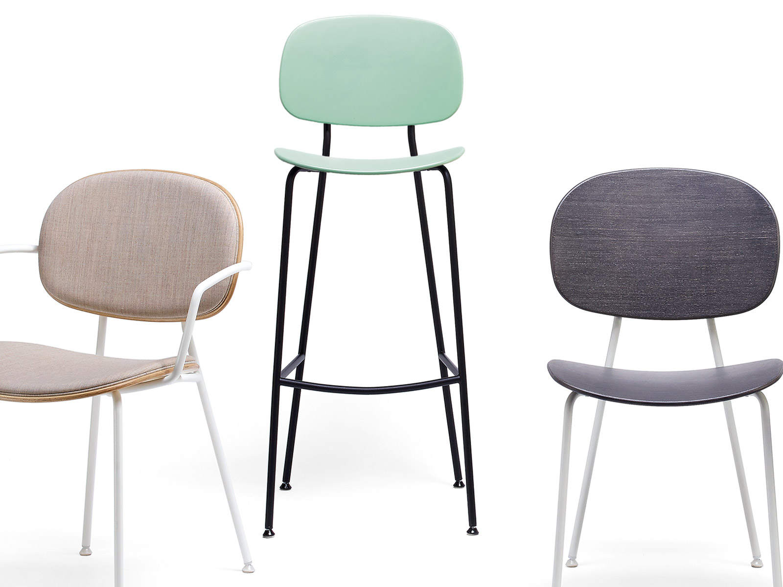 Tondina est également disponible avec une assise et un dossier en bois multiplis, avec assise tapissée, en chaise hauteur standard avec ou sans accoudoirs, recouverte de multiplis ou tapissée.