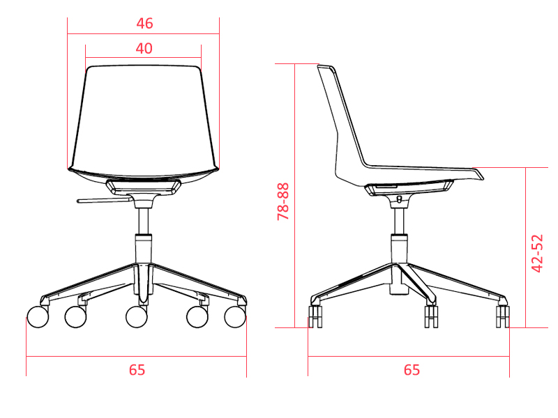 Origami a un encombrement de 65 cm de largeur et 65 cm de profondeur. Il est réglable en hauteur avec une assise allant de 42 à 52 cm de hauteur. La hauteur totale du siège varie de 78 à 88 cm.