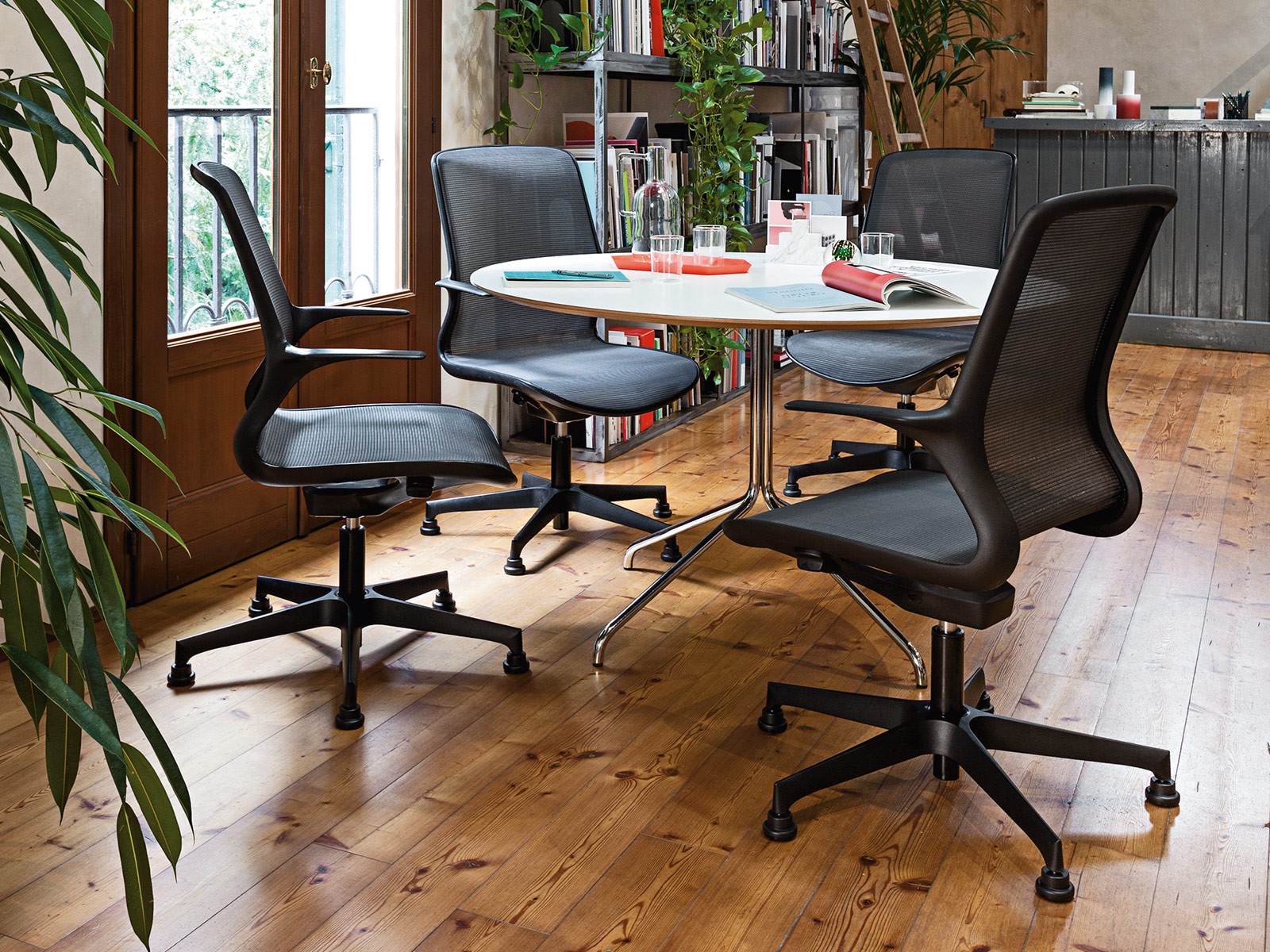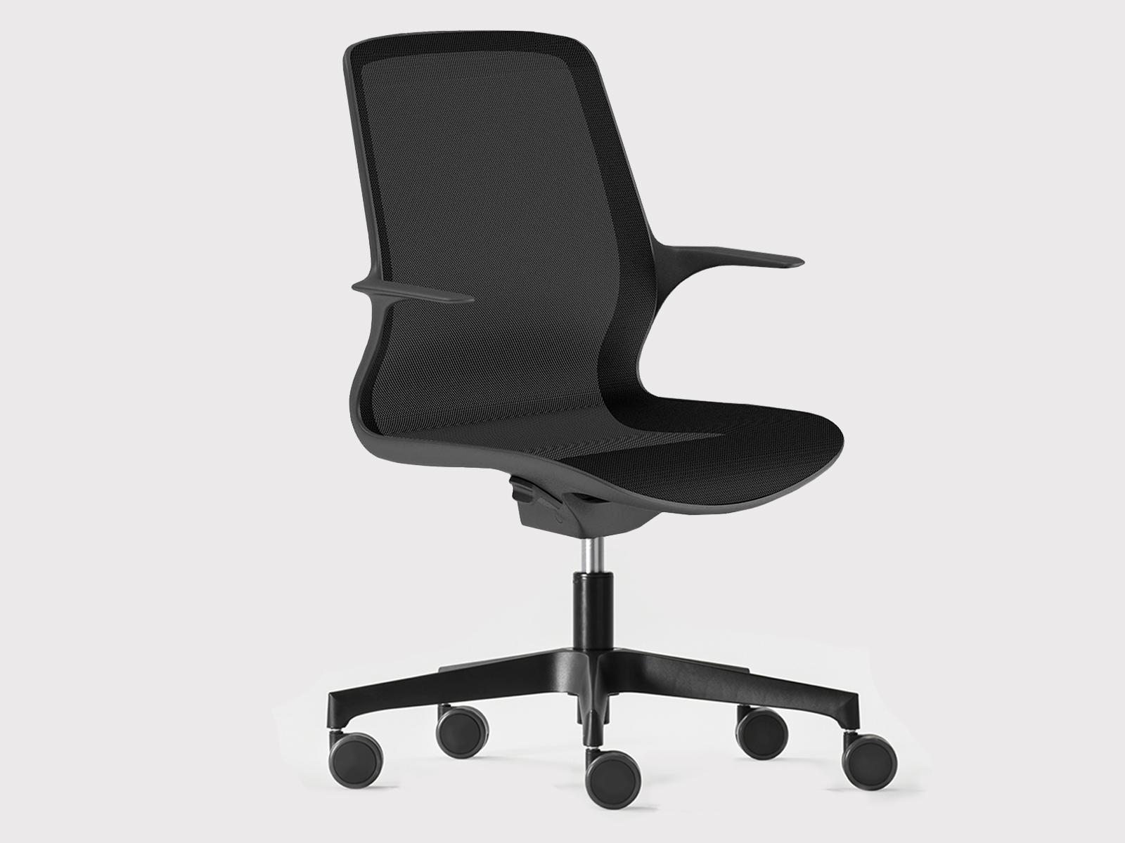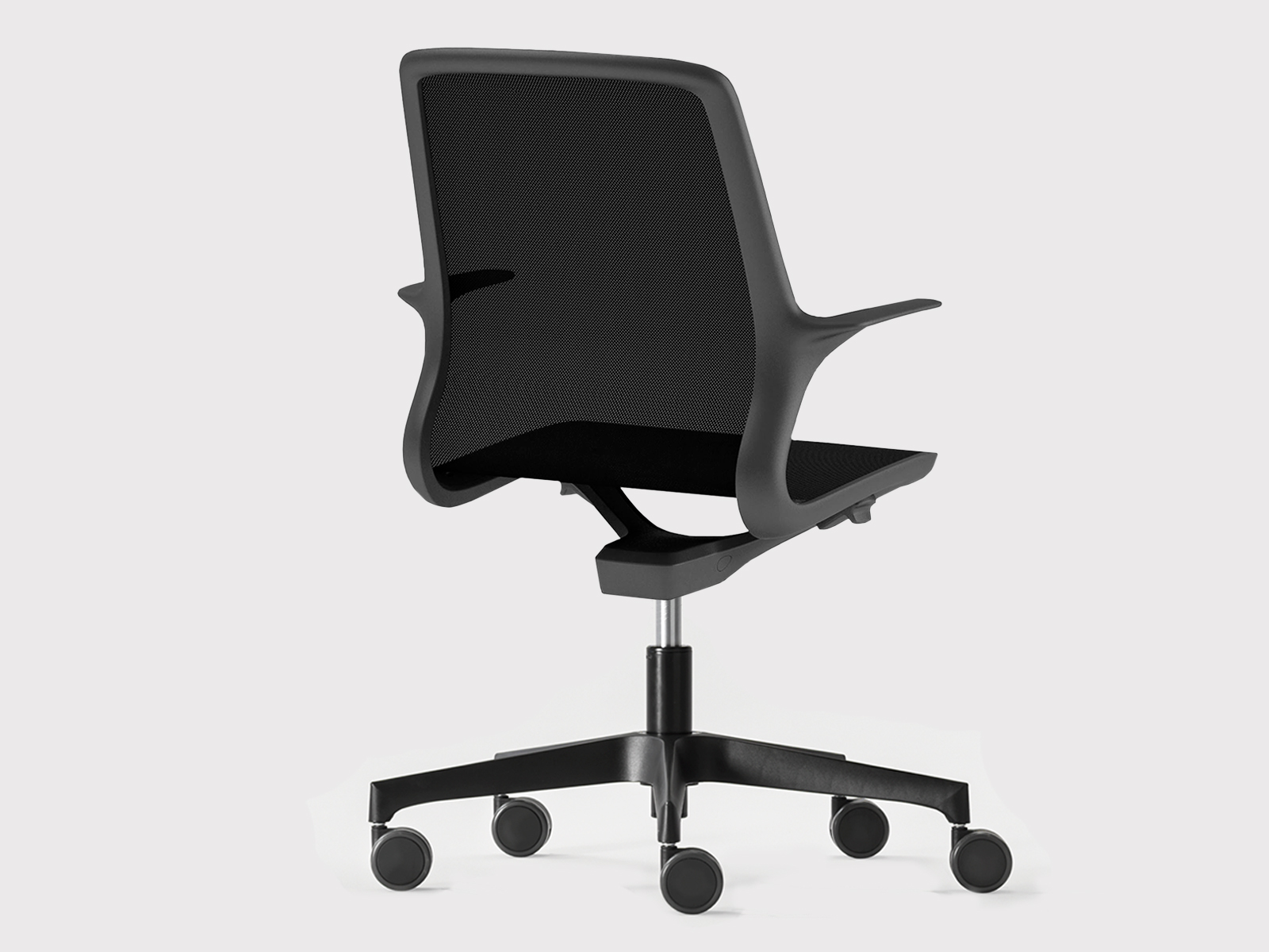 Le piètement est en nylon à 5 branches équipé par défaut de roulettes auto-freinées pleines pour sol souple (visibles sur les modèles noirs). Il est possible de commander des roulettes ajourées assorties à la structure (voir modèles blancs), ou des roulettes pour sol dur, sur demande et avec supplément.