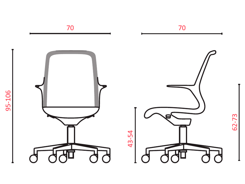 Le siège a un encombrement de 70 cm de large sur 70 cm de profondeur. L'assise varie de 43 à 54 cm et la hauteur totale de 95 à 106 cm.