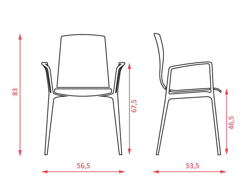 Gorka a une hauteur d'assise à 46,5 cm du sol. Son encombrement est de 56,5 cm de largeur, 53,2 cm de profondeur et 83 cm de hauteur. Les accoudoirs fixes sont à 67,5 cm du sol.