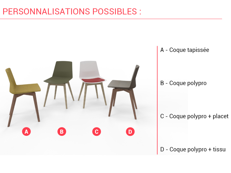 En mélangeant ses matériaux, Etner offre la possibilité de créer plusieurs combinaisons. La coque et le tissu peuvent s'unir ou se contraster, mieux encore la tapisserie pourra recouvrir l’entièreté de la coque ou bien habillée seulement l'assise. Pour davantage de sobriété, Origami ne peut aussi être qu'en version tout polypropylène, afin de jouer uniquement sur la couleur de la coque.