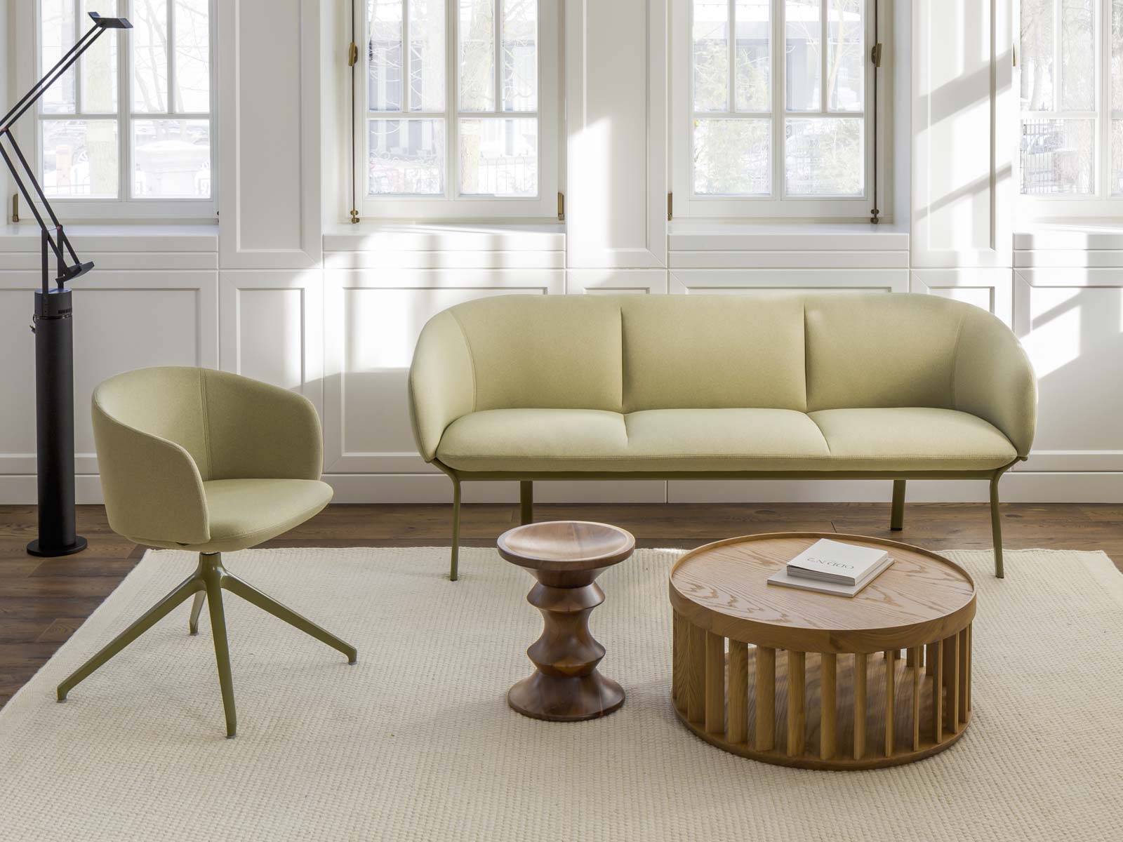 Le siège giratoire Grace peut avoir différentes fonctions et meubler divers lieux car il est composé d'une assise épaisse et confortable avec accoudoirs intégrés et d'un piètement giratoire à 360°, très pratique pour les réunions de travail. Personnalisable avec un grand choix de tissus, coloris et finitions de piètement, Grace saura se fondre dans toutes les décorations.
