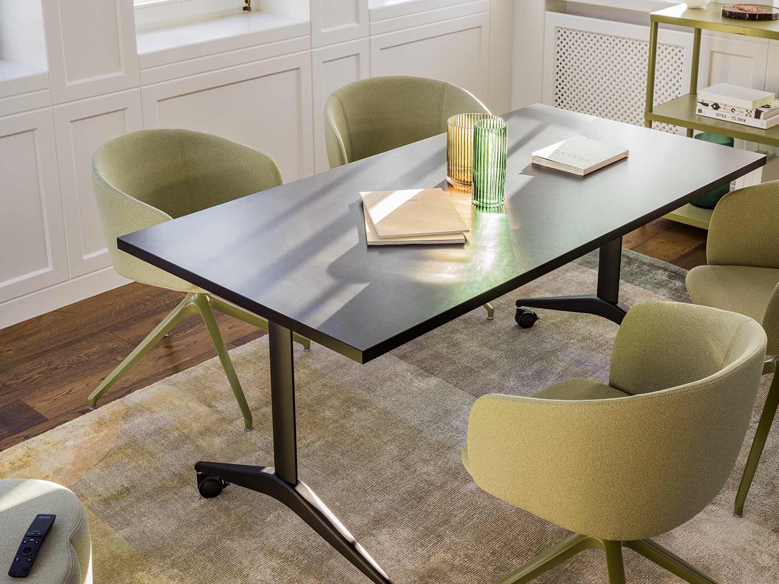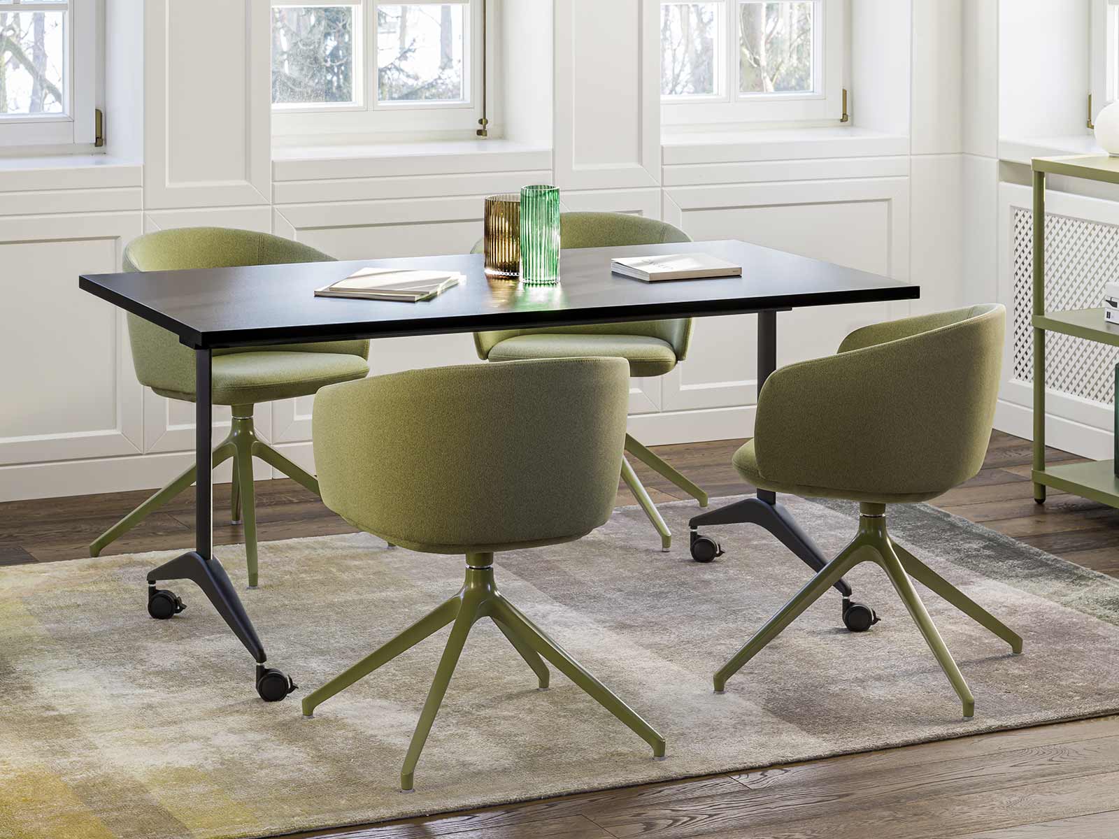 Grace se décline en différentes structures, pour répondre aux préférences et aux exigences de chacun : base pyramidale à 4 branches à roulettes, 4 pieds métal, chaise haute, piètement entièrement tapissé, fauteuil d'accueil, banquette 2 et 3 places et table carrée et rectangulaire.