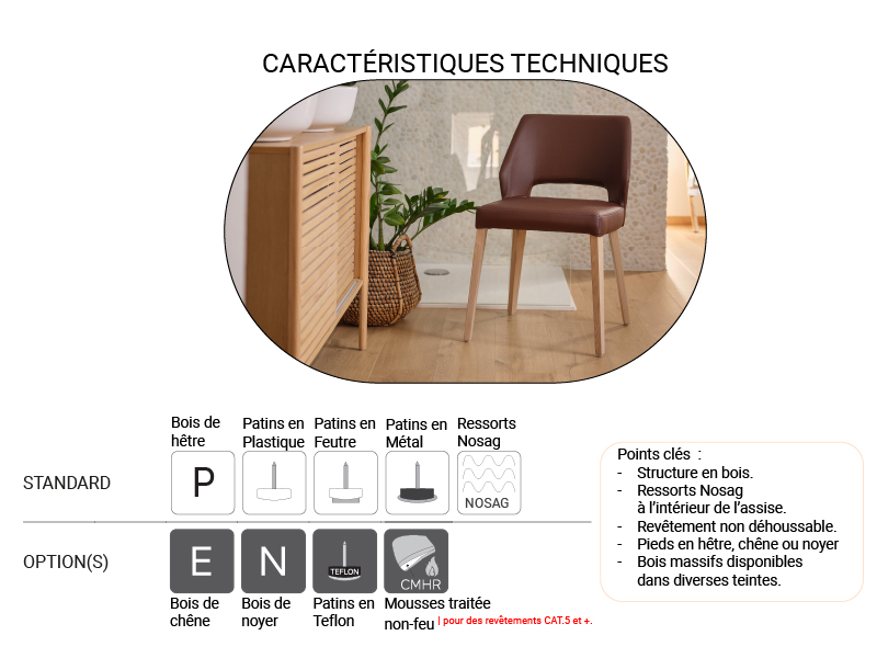 Le fauteuil est soigneusement recouvert d’un choix varié de revêtements, incluant tissus, alcantara, simili-cuir ou cuir véritable. Spécialement conçue pour un usage professionnel, la chaise peut être habillée d’un tissu ®Aquaclean, facilement lavable à l’eau. Se destinant aux milieux professionnels contract et CHR, des solutions de revêtements non-feu vous sont également proposés par le fabricant belge (voir les conditions dans l'infographie "caractéristiques techniques"). Un large éventail de piètements en bois massif de hêtre, de chêne ou de noyer est disponible dans des teintes naturelles variées, allant des tons clairs aux tons plus sombres.