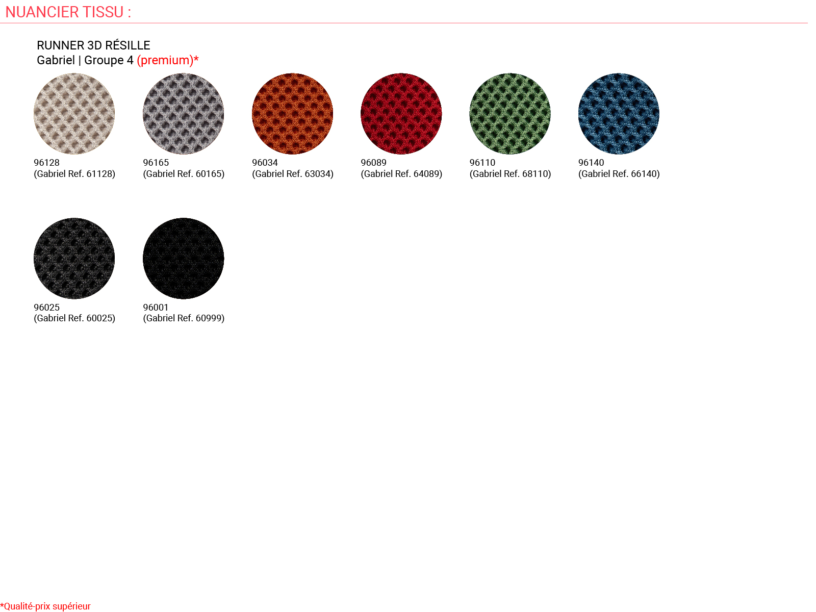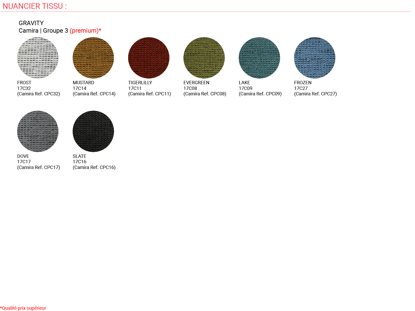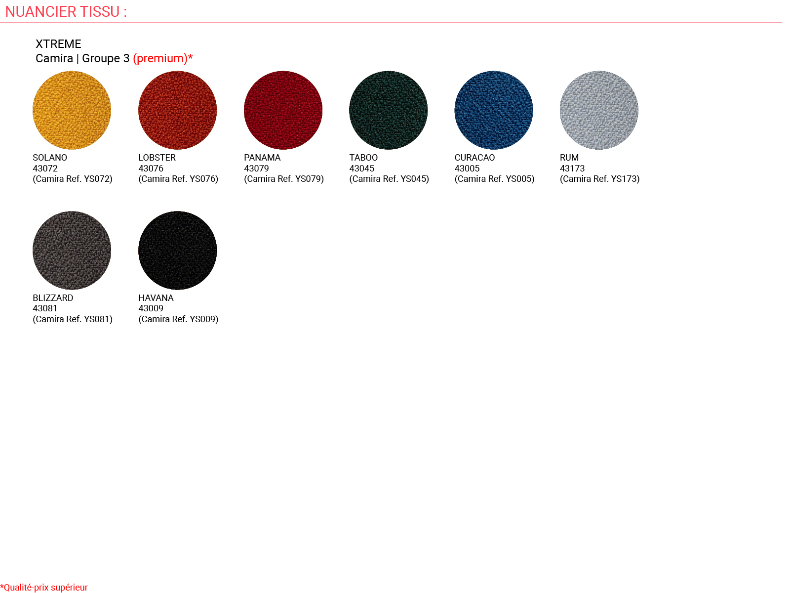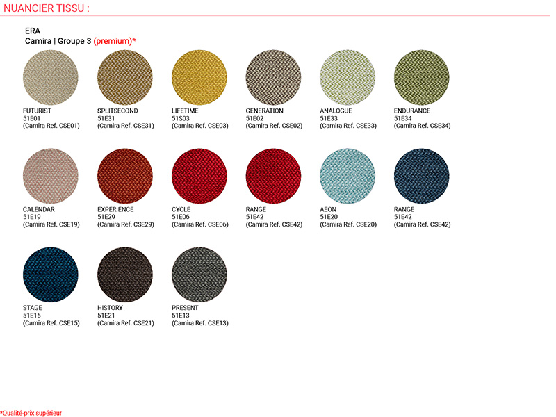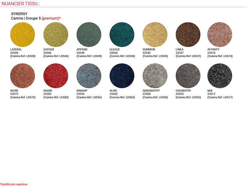 rembourrage en mousse injectée de polyuréthane d’une densité de 62 kg/m³ qui assure une assise plutôt moelleuse. Pour correspondre à bon nombre d’espaces professionnels, vous pourrez choisir le tissu parmi une sélection de grandes marques :