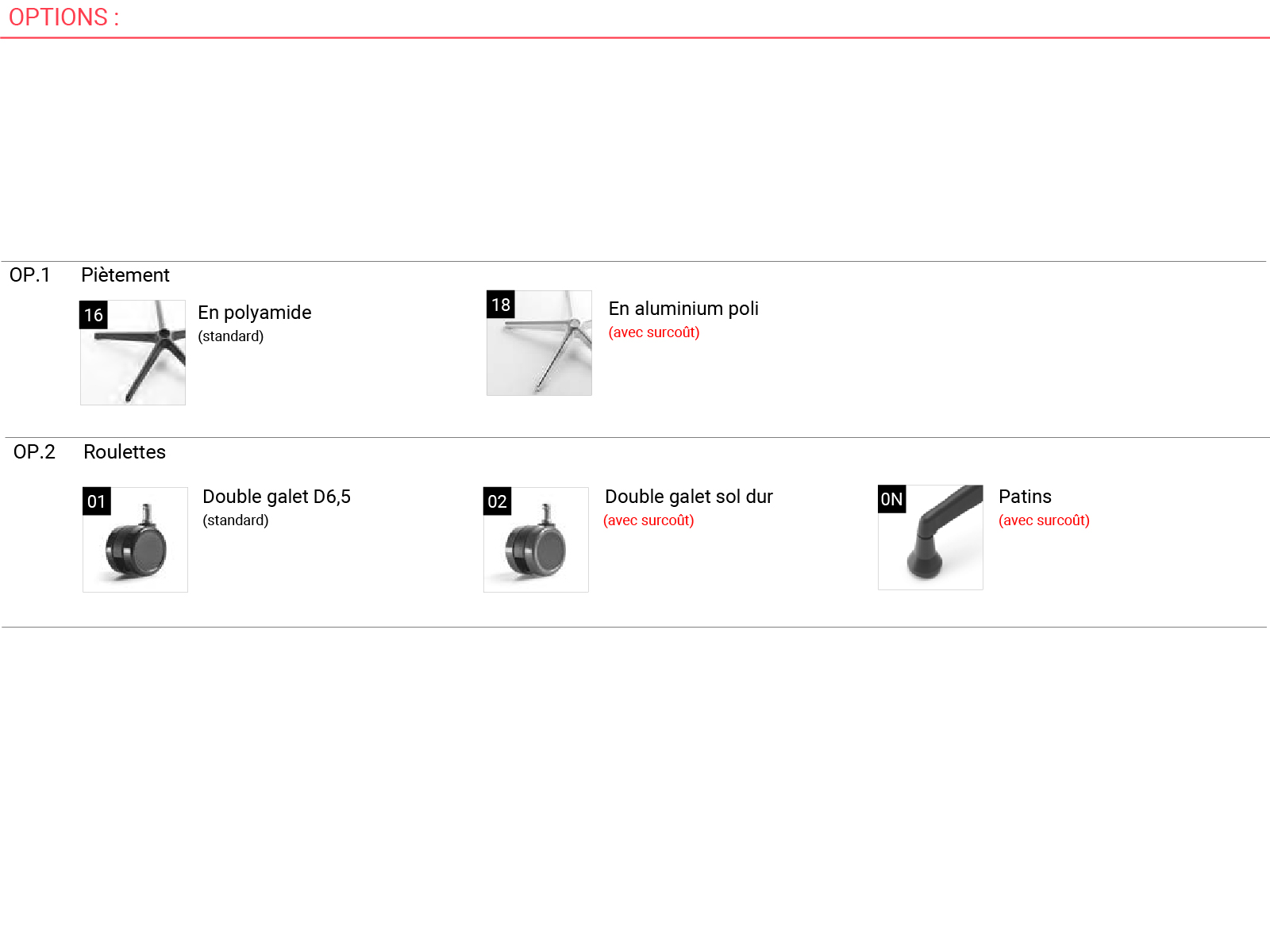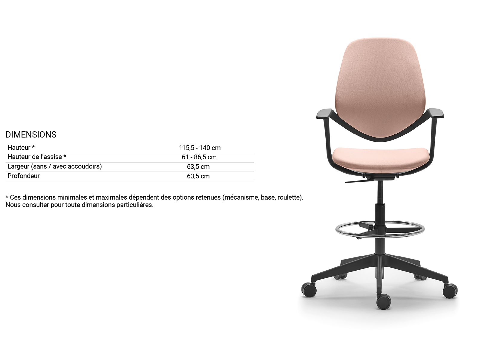 Notre configurateur ci-contre propose une configuration standard du siège, mais il est possible d’aller beaucoup plus loin. Le cadre demeurera blanc ou noir, cependant le tissu de l’assise et du dossier est personnalisable selon vos envies. L’embase en étoile existe aussi en aluminium poli. Les roulettes (Ø65 mm) sélectionnées par défaut sont adaptées aux sols souples. Des déclinaisons pour sol durs ou encore des patins sont disponibles auprès du fabricant. Si besoin, le mécanisme synchrone peut être complété d’une translation d’assise ajustable sur 5 profondeurs.