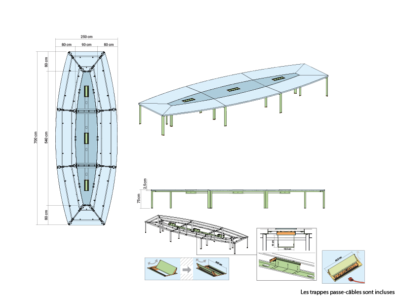ensemble de trois trappes passe-câbles avec goulotte (petite gouttière placée sous le plateau) inclus, permettant d'acheminer vos câbles. Cependant, les multiprises ne sont pas incluses. Sur notre site, vous pourrez retrouver